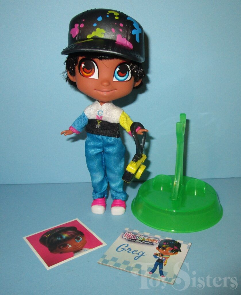 Colorful Greg was released in Hairdudeables Series Two. He came with a camera, stand, name card, and series insert. He was packaged with Kat’s Got Your Bag. He was also later sold individually in a mystery box that contained a Dude from Series One or Two (but had Series 3 Dudes on the box- it was very confusing). To return to Hairdudeables Series Two, click here. To return to the Greg character page, click here.