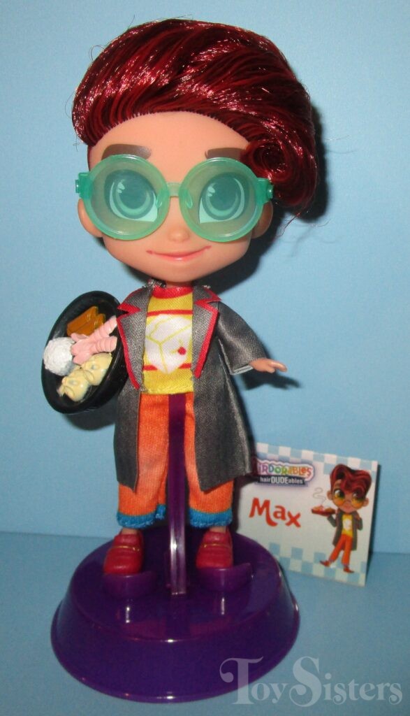 Takeout Max was released in Hairdudeables Series Two. He came with a , stand, name card, and series insert. He was packaged with Sweetie Skylar. He was also later sold individually in a mystery box that contained a Dude from Series One or Two (but had Series 3 Dudes on the box- it was very confusing). To return to Hairdudeables Series Two, click here. To return to the Max character page, click here.