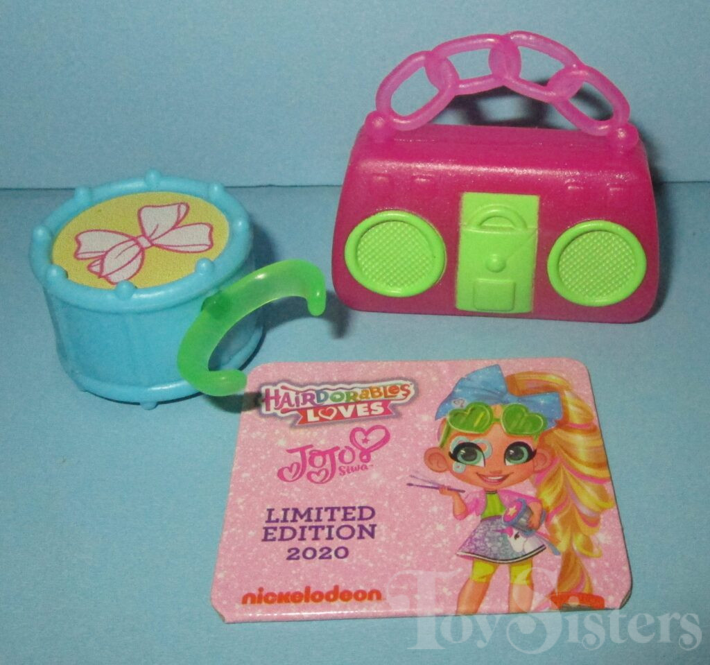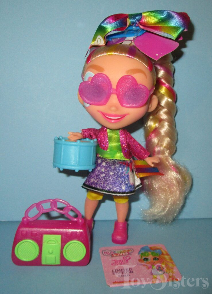 This Jojo Siwa came with a hair bow, drum, stereo, glasses, and character card. To return to the Jojo release menu, click here. To return to the Jojo character page, click here.