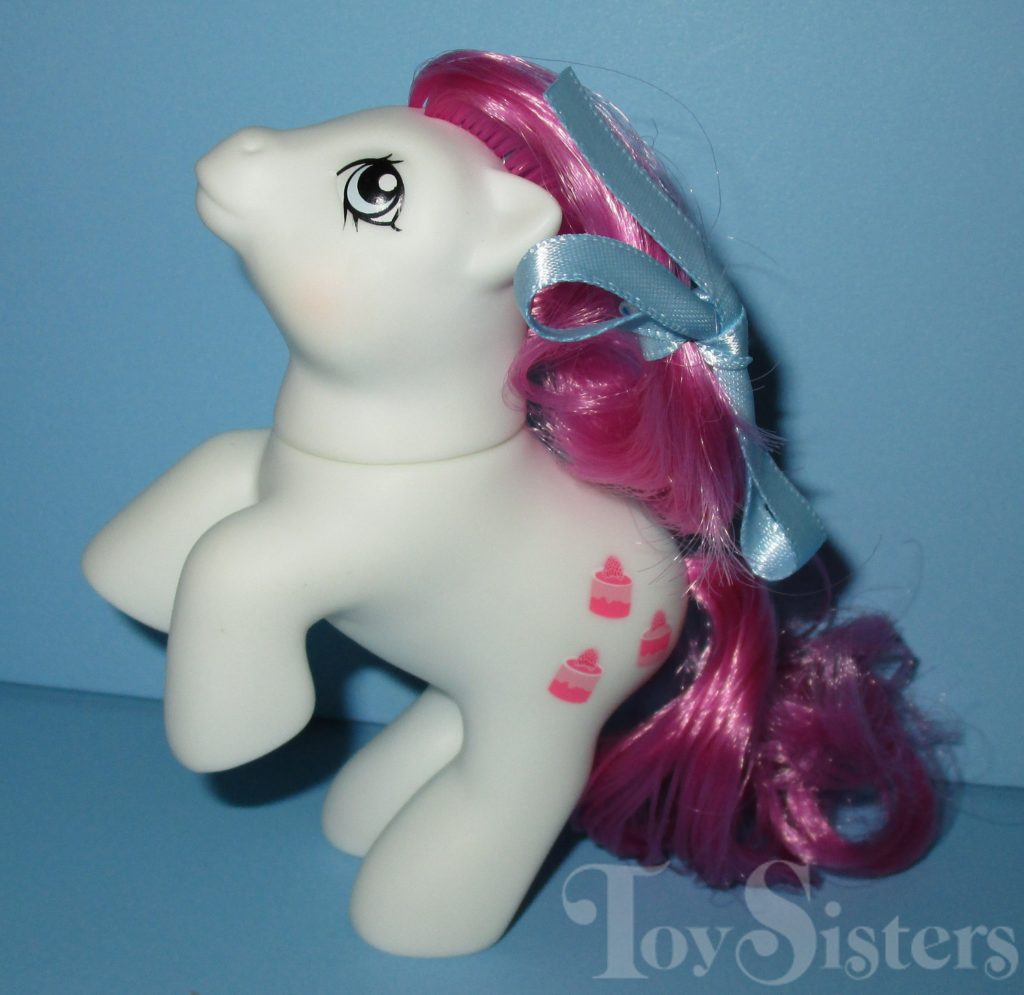 Berry Torte is a Sweet Treat Sister. She was first available for sale in the 2018 Mega Bundle. She would later be sold individually and in sets with her sister. She came packaged with a blue ribbon. To return to the HQG1C menu, click here. To view the ponies by series instead, click here.