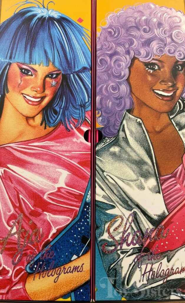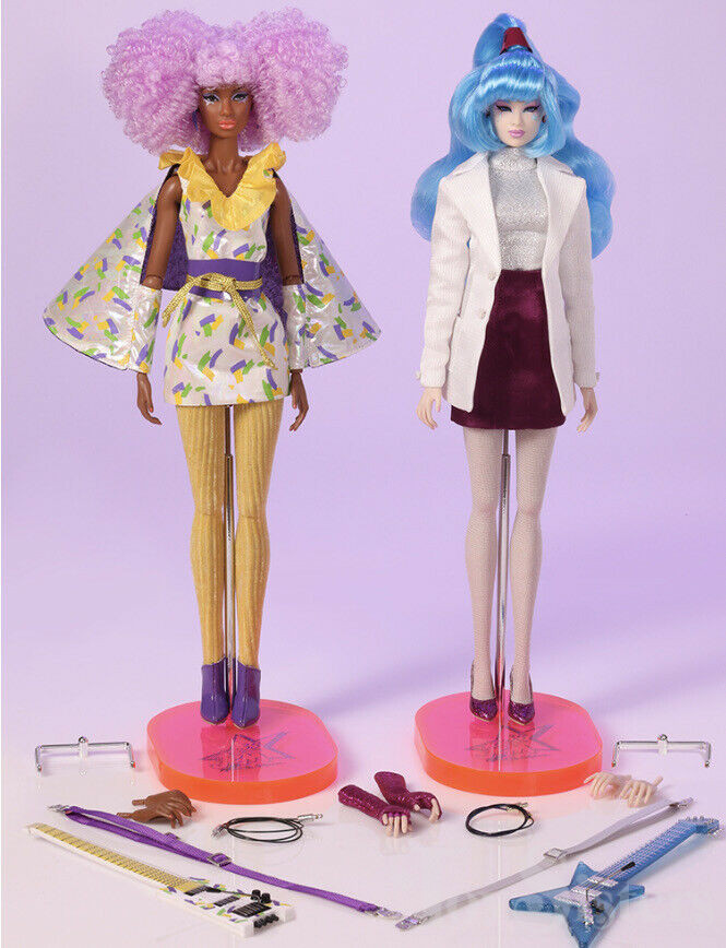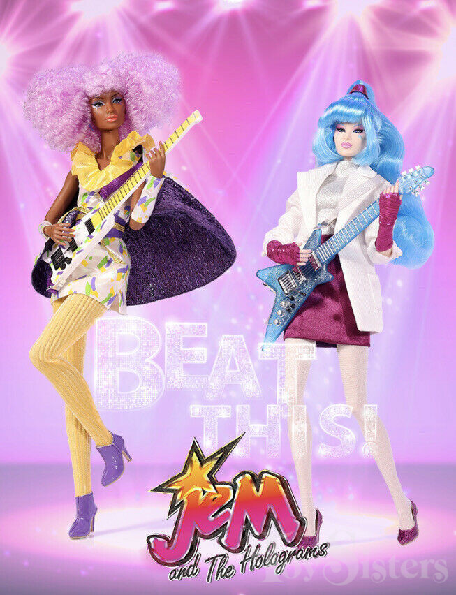 This doll set was released in 2020. It was a limited edition of 600 doll sets. The set included Aja Leith & Shana Elmsford. They came with guitars, guitar straps, cords, stands, and extra hands. To return to the Jem menu, click here.