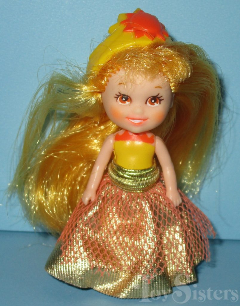 This is the Krystal Princess doll named Princess Krystal Sunbeams. Like all Krystal Princess dolls, she came with a dome, comb, tiara, and skirt. To return to the Krystal Princess doll menu, click here. To return to the main Krystal Princess menu, click here.