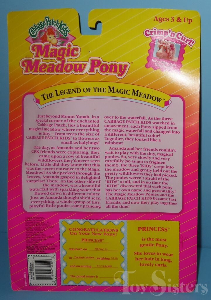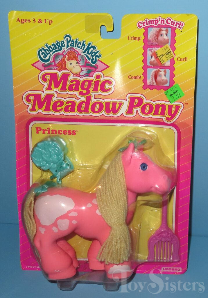 This Princess is from the first set of Crimp ‘n Curl ponies. Crimp ‘n Curl ponies have hair that looks like yarn, but the hair is actually designed to hold shape and be crimped/styled/turned into gravity-defying hairdos. Each pony in the set comes with two hair styling tools. To return to the Crimp ‘n Curl menu, click here. To return to the main Magic Meadow menu, click here.