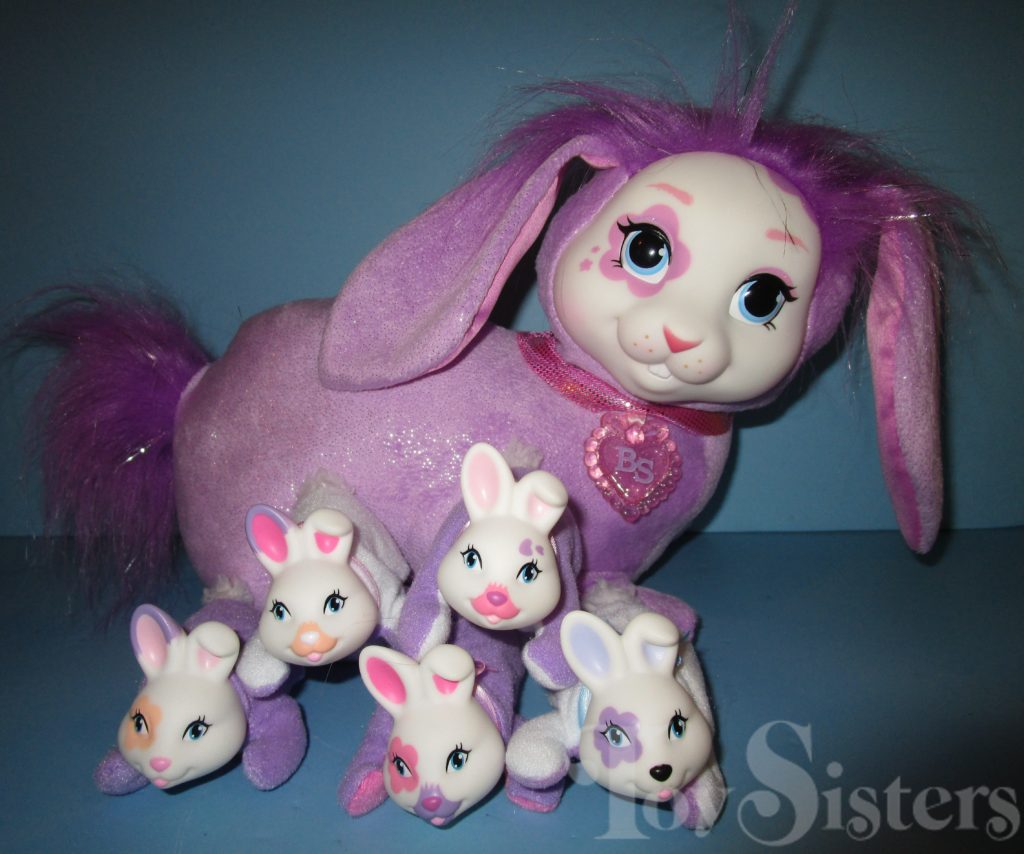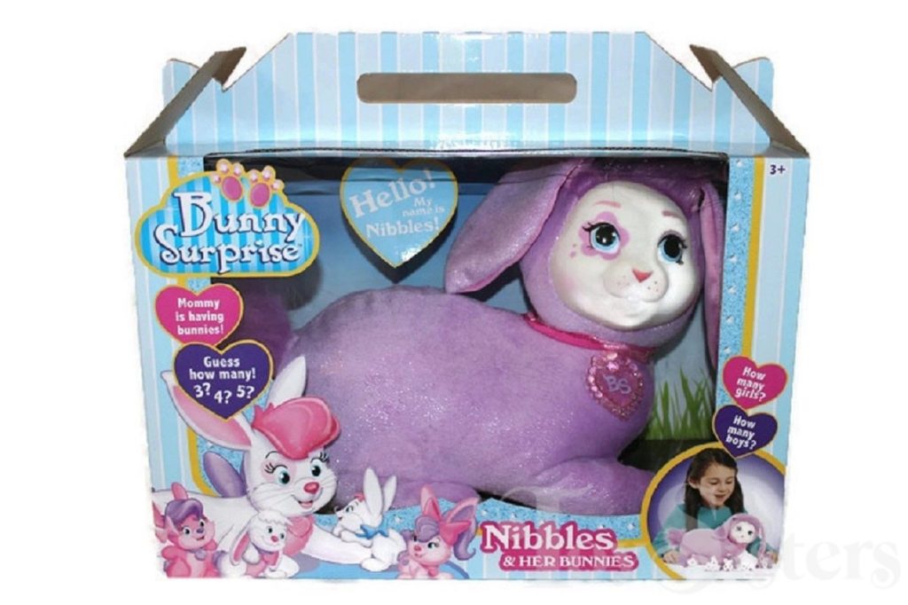 Nibbles is a Bunny Surprise mommy plush released by the toy line Just Play. She could come with three, four, or five babies tucked in her tummy pouch. To see other Just Play mommy bunnies, click here.