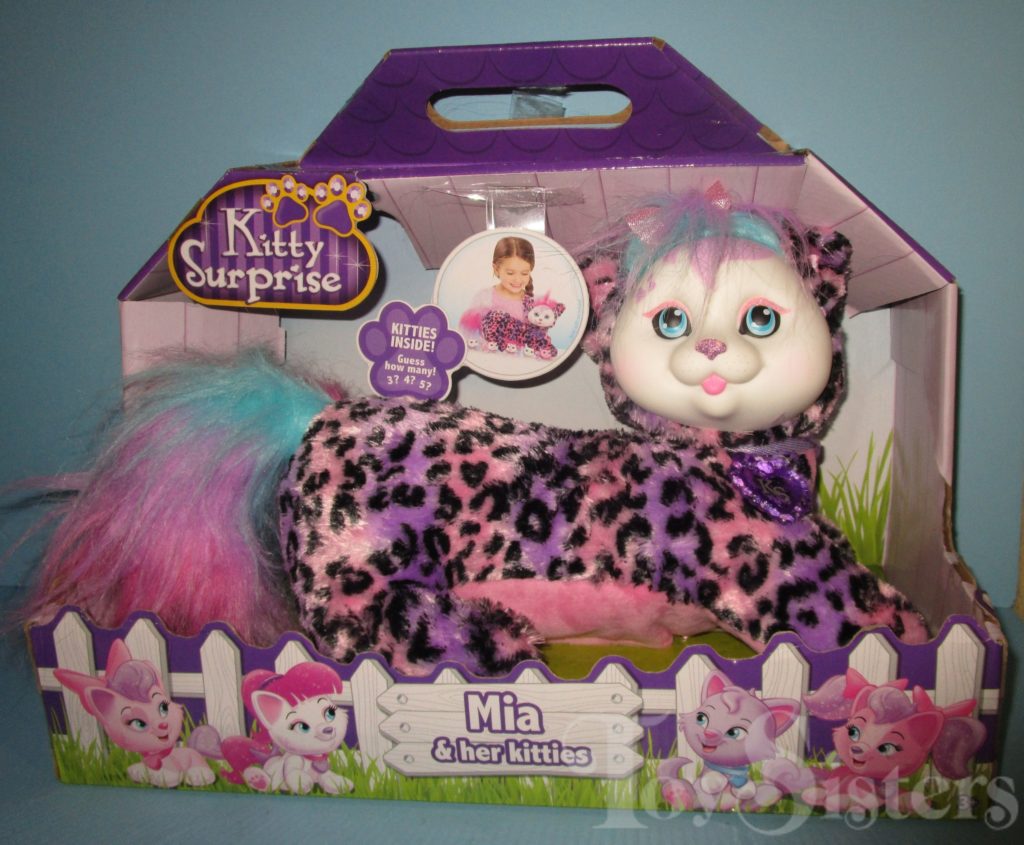 Mia is a Kitty Surprise mommy plush released by the toy line Just Play in 2020.  She could come with three, four, or five kittens tucked in her tummy pouch.  To see other Just Play mommy cats, click here.  Mia came with the same kittens as Tasha.