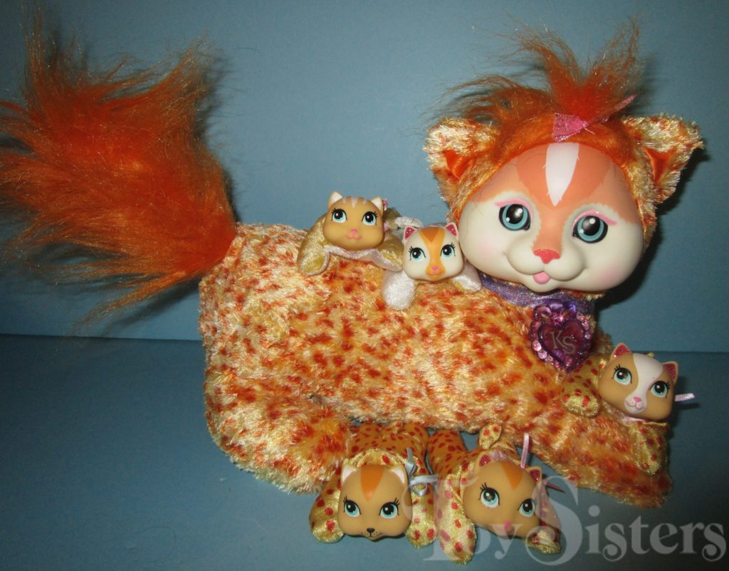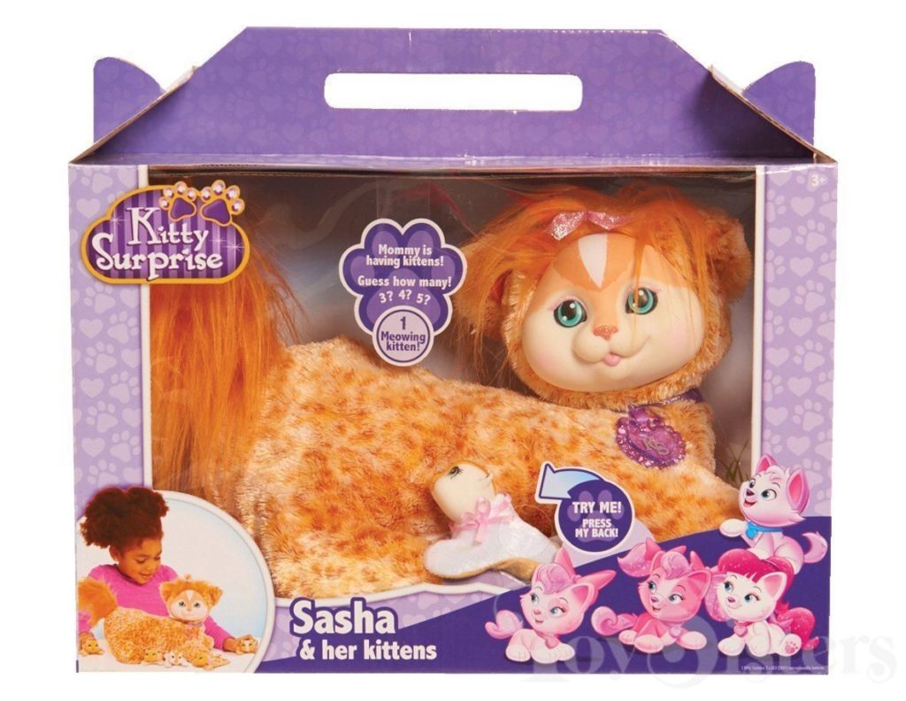 Sasha is a Kitty Surprise mommy plush released by the toy line Just Play. She could come with three, four, or five kittens tucked in her tummy pouch. To see other Just Play mommy cats, click here.