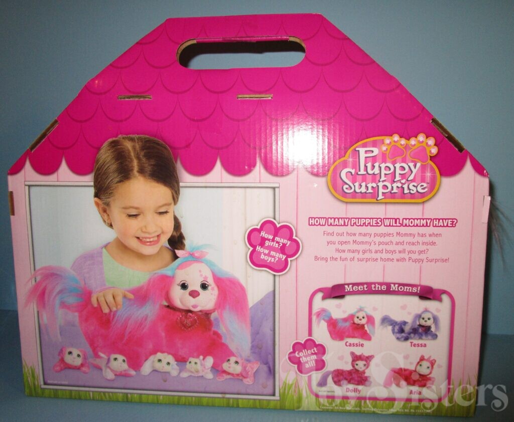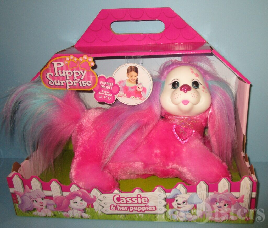 Cassie is a Puppy Surprise mommy plush released by the toy line Just Play. She could come with three, four, or five puppies tucked in her tummy pouch. To see other Just Play mommy dogs, click here.
