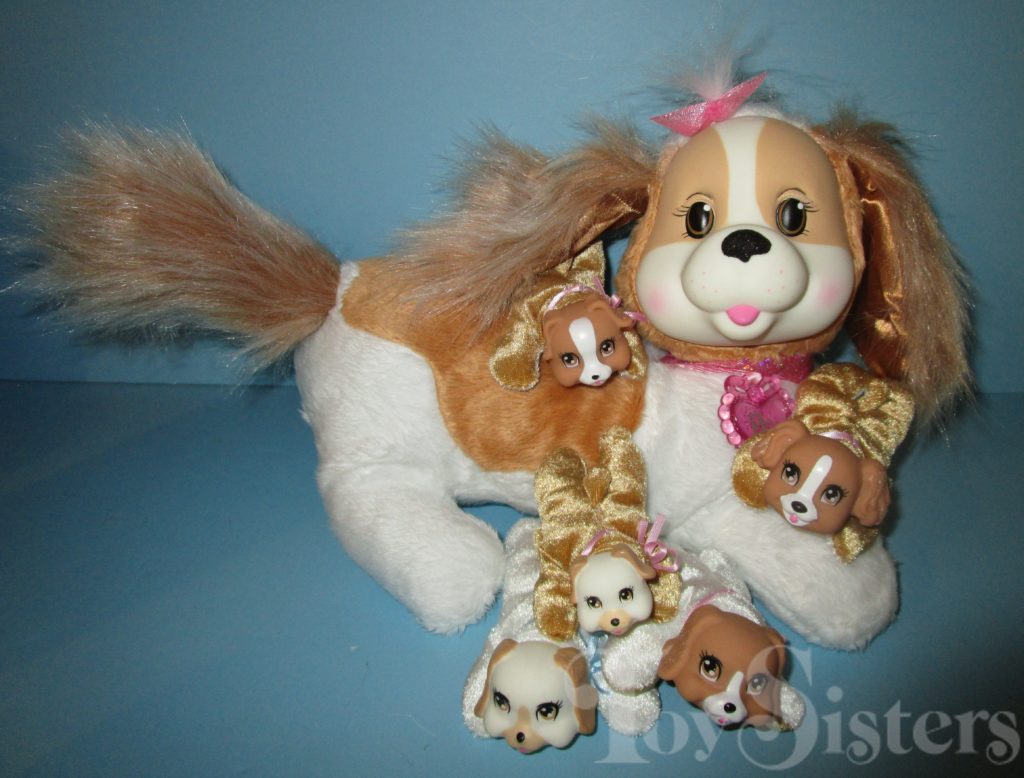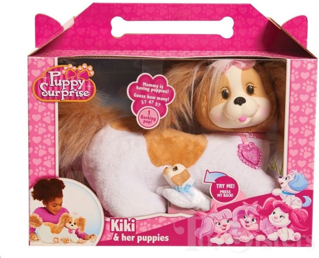 Kiki is a Puppy Surprise mommy plush released by the toy line Just Play. She could come with three, four, or five puppies tucked in her tummy pouch. To see other Just Play mommy dogs, click here.