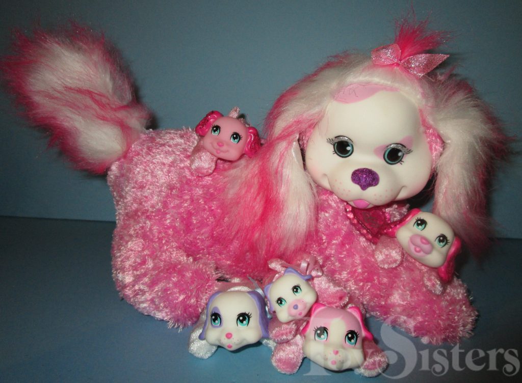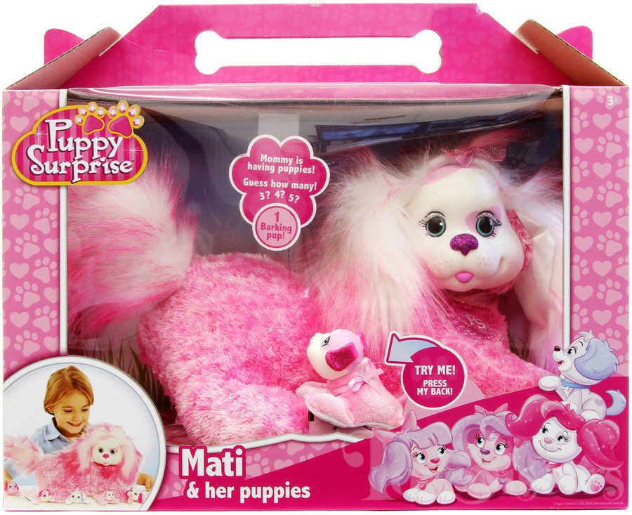 Mati is a Puppy Surprise mommy plush released by the toy line Just Play. She could come with three, four, or five puppies tucked in her tummy pouch. To see other Just Play mommy dogs, click here.