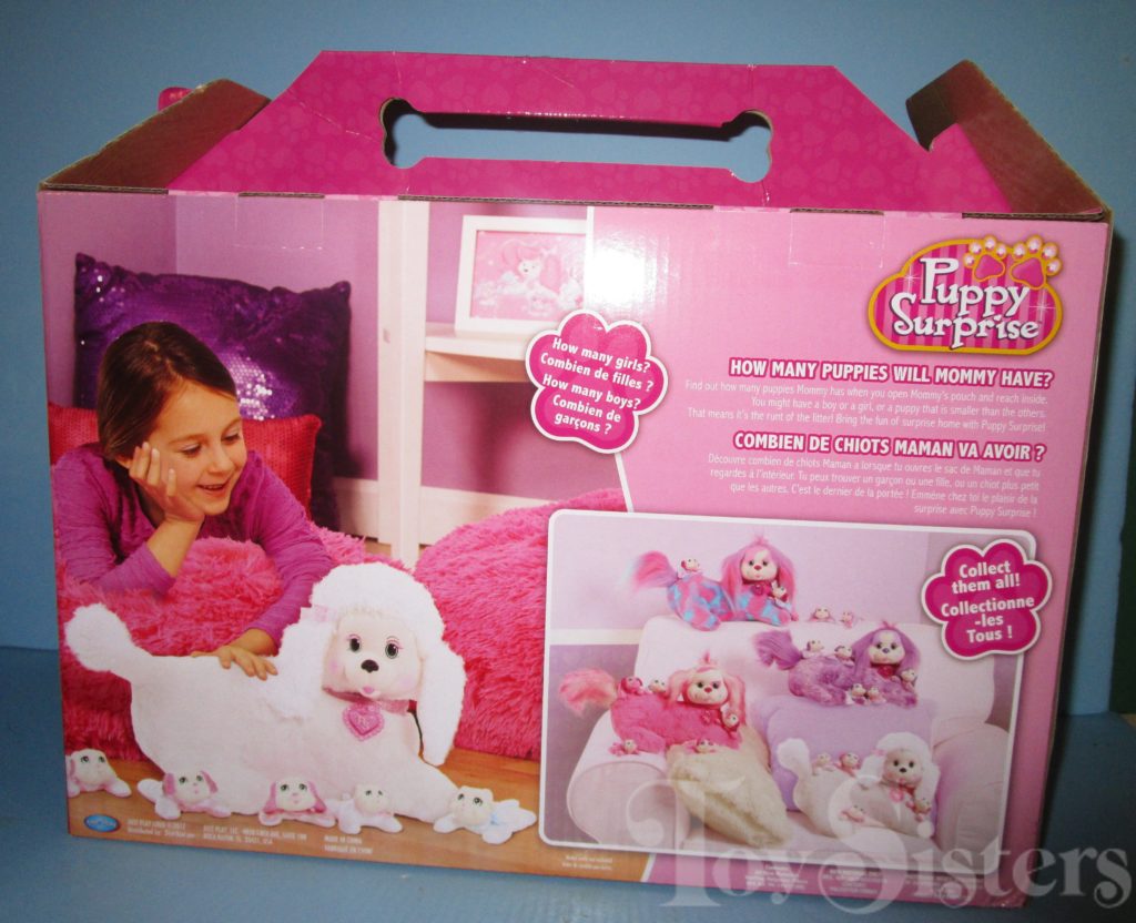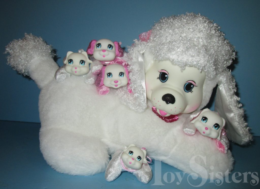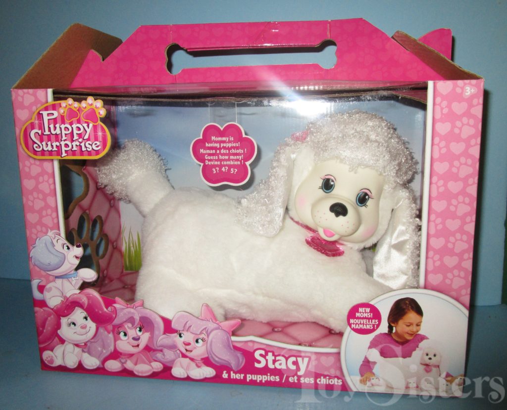 Stacy is a Puppy Surprise mommy plush released by the toy line Just Play.  She could come with three, four, or five puppies tucked in her tummy pouch.  To see other Just Play mommy dogs, click here.