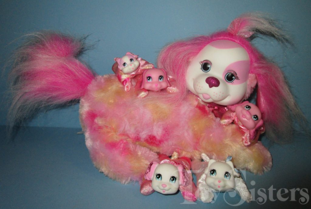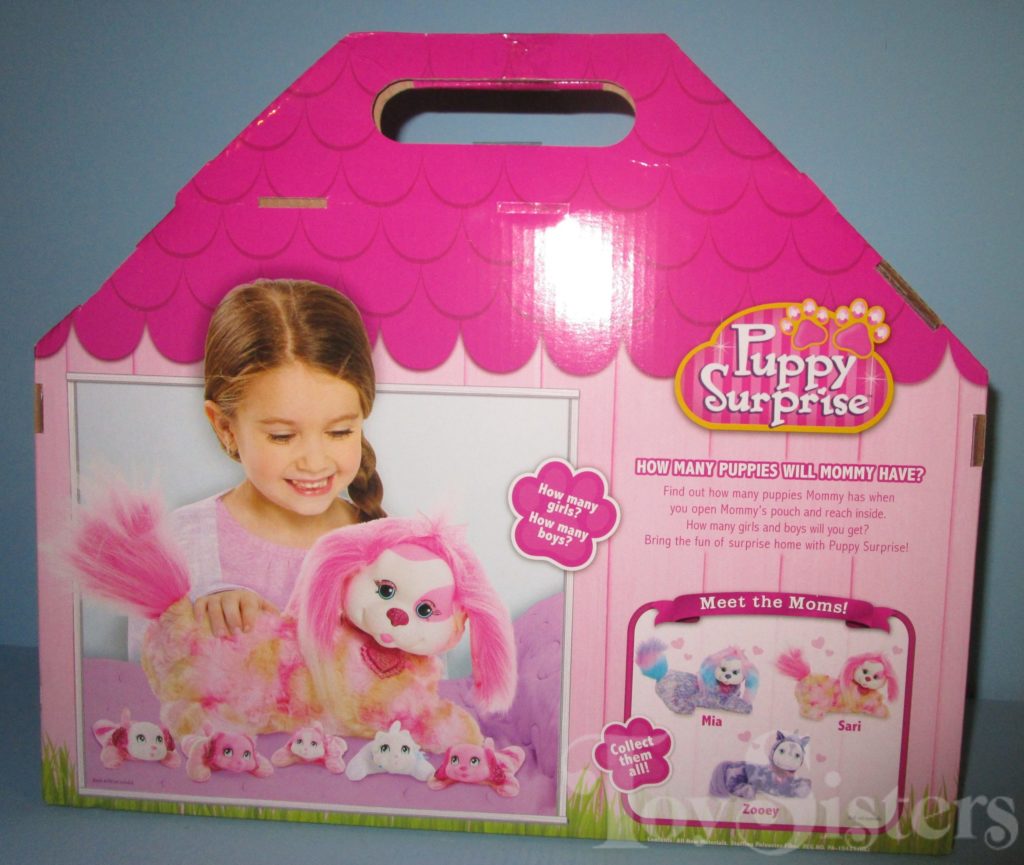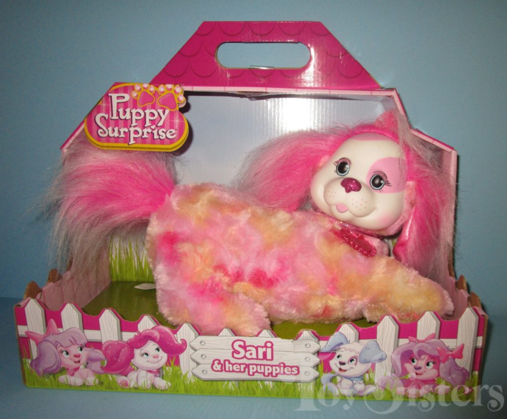 Sari is a Puppy Surprise mommy plush released by the toy line Just Play. She could come with three, four, or five puppies tucked in her tummy pouch. To see other Just Play mommy dogs, click here.