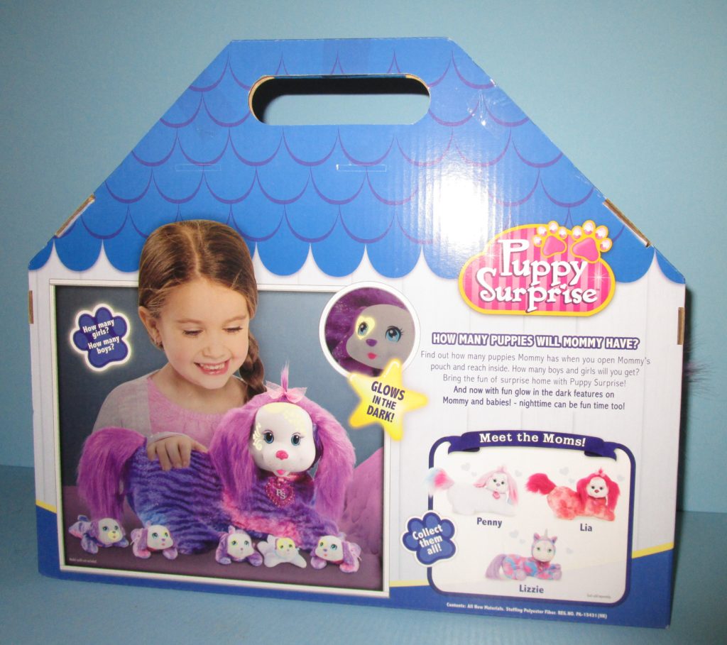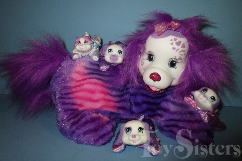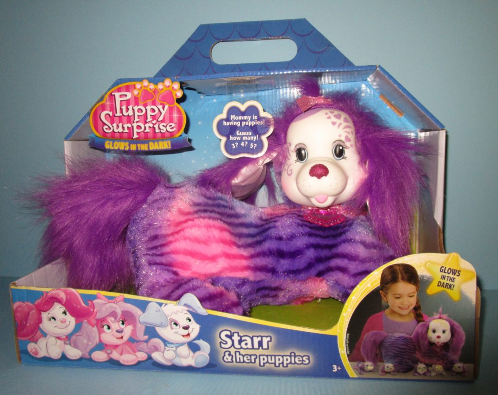 Starr is a Puppy Surprise mommy plush released by the toy line Just Play. She could come with three, four, or five puppies tucked in her tummy pouch. To see other Just Play mommy dogs, click here. Starr glows in the dark. I have only been able to identify four different puppies for her.
