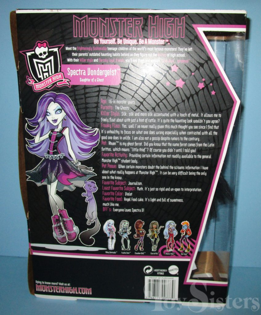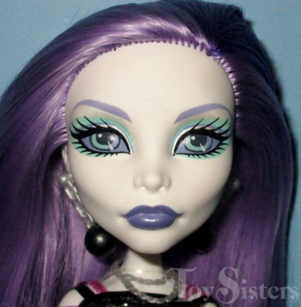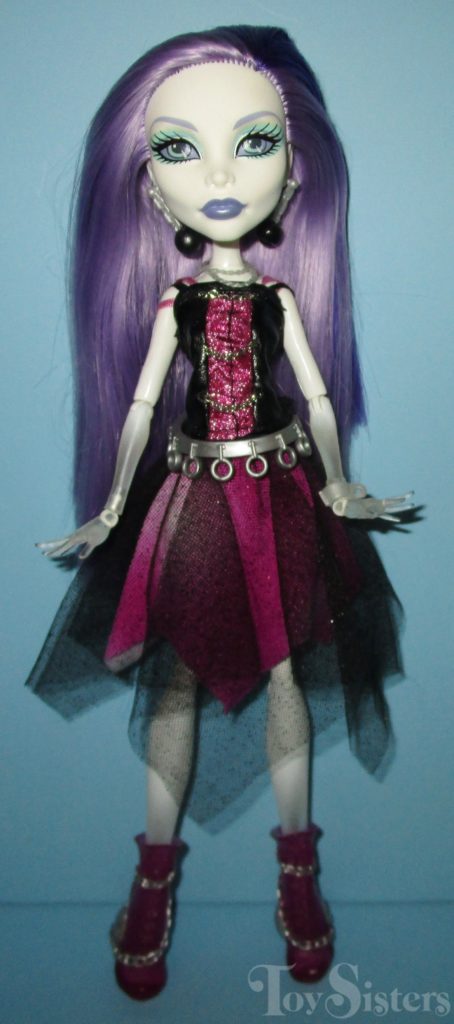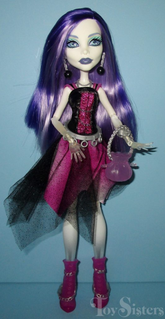 This was the first Spectra Vondergeist doll. This wave of dolls is also called School’s Out. Spectra came with a purse, diary, purple stand, purple brush, and pet ferret (Rhuen). The first run of this Spectra doll was made in Indonesia. The later dolls to hit the stores were made in China. In 2024, a Creeproduction was released.