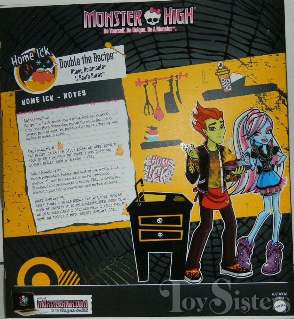 Classroom Double the Recipe Abbey Bominable & Heath Burns were released in 2013.  They were made in Indonesia.  They came with a spoon, tongs, measuring cup, plate, purple container with a green lid, bowl of yak cheese, brush, and Home Ick notebook.  To see the other releases of the Monster High character Abbey Bominable, click here.  To see other releases of the Monster High character Heath Burns, click here.