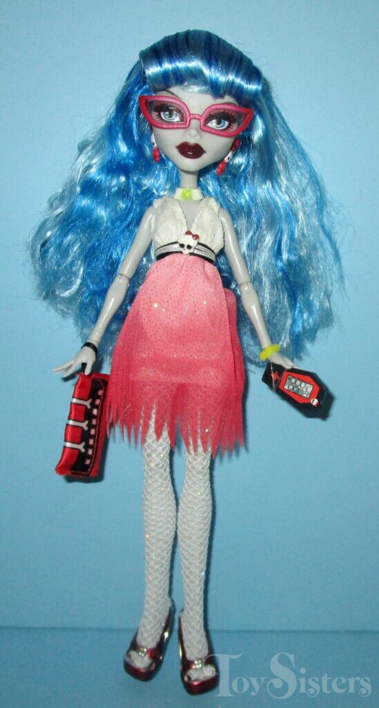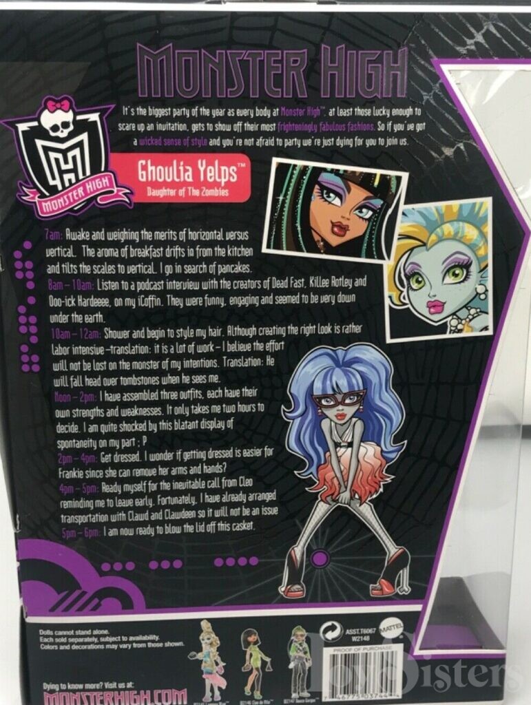 Dawn of the Dance Ghoulia Yelps was released in 2011. She came with a stand, yellow brush, purse, DVD and iCoffin. She was made in Indonesia. To see the other releases of the Monster High character Ghoulia Yelps, click here.