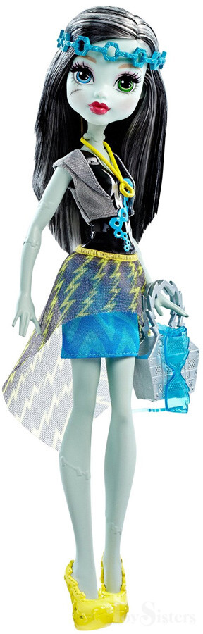 Day-To-Night Frankie Stein was released in 2016. She is not articulated at her elbows or knees and her shirt is molded on. She came with a purse, necklace, headband, extra pair of shoes, sunglasses, and a binder. To see the other releases of the Monster High character Frankie Stein, click here. To see other G2 Monster High dolls, click here.