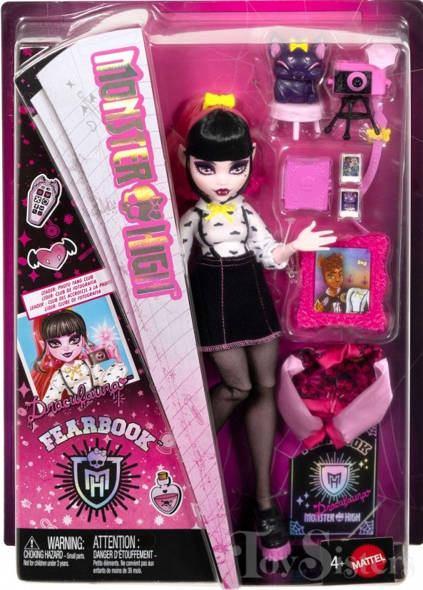 Fearbook Draculaura was released in 2024. She came with a jacket, fearbook, camera, pictures, notebook, and pet. To see the other releases of the Monster High character Draculaura, click here.