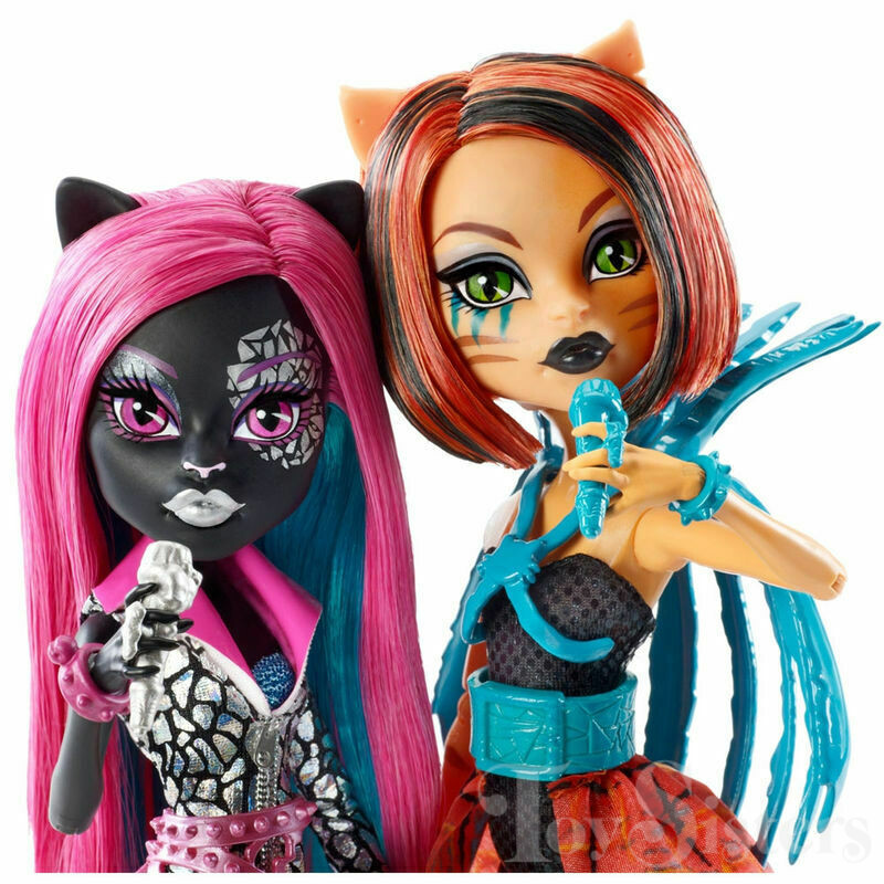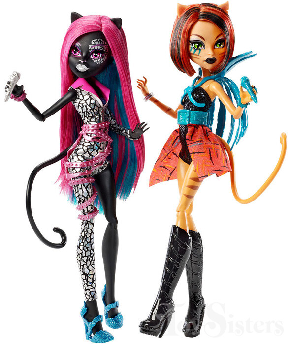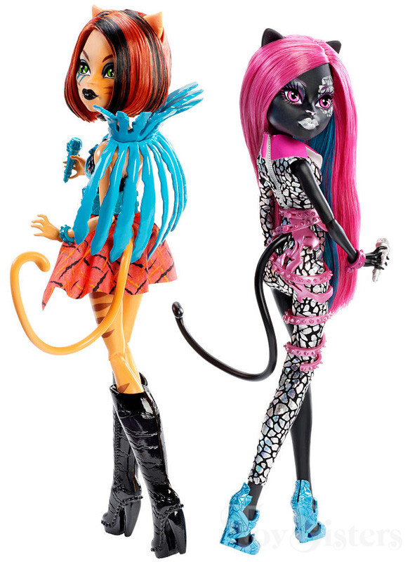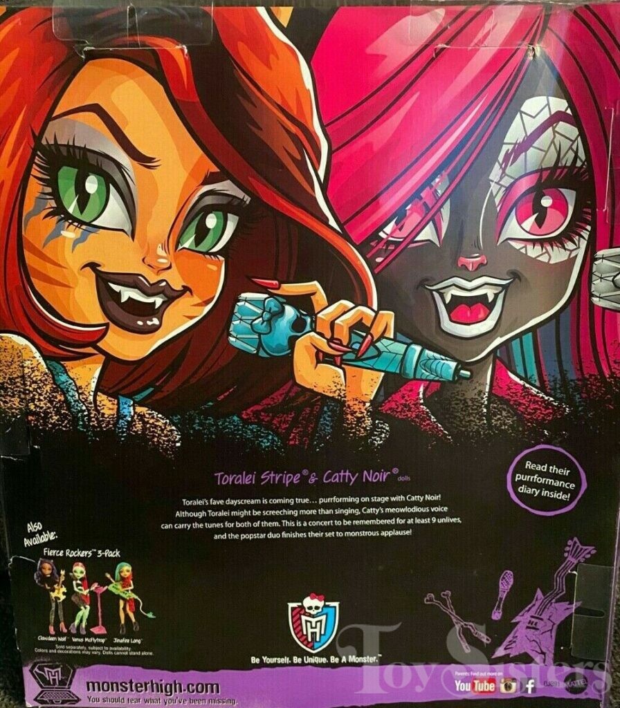 The Fierce Rockers 2-Pack was released in 2016 at Toysrus. The set included Toralei Stripe and Catty Noir. They were made in Indonesia. They came with two stands, a diary, and two microphones. To see the other releases of these Monster High characters click on their names: Toralei Stripe or Catty Noir.