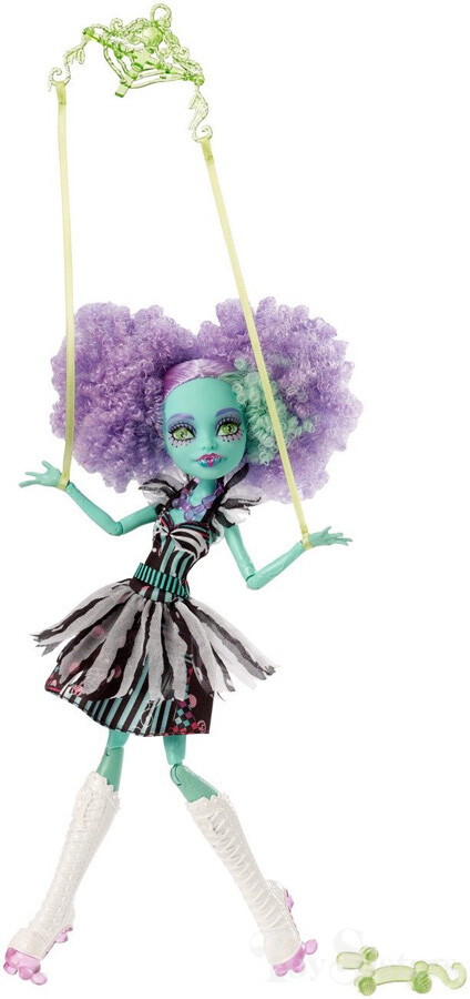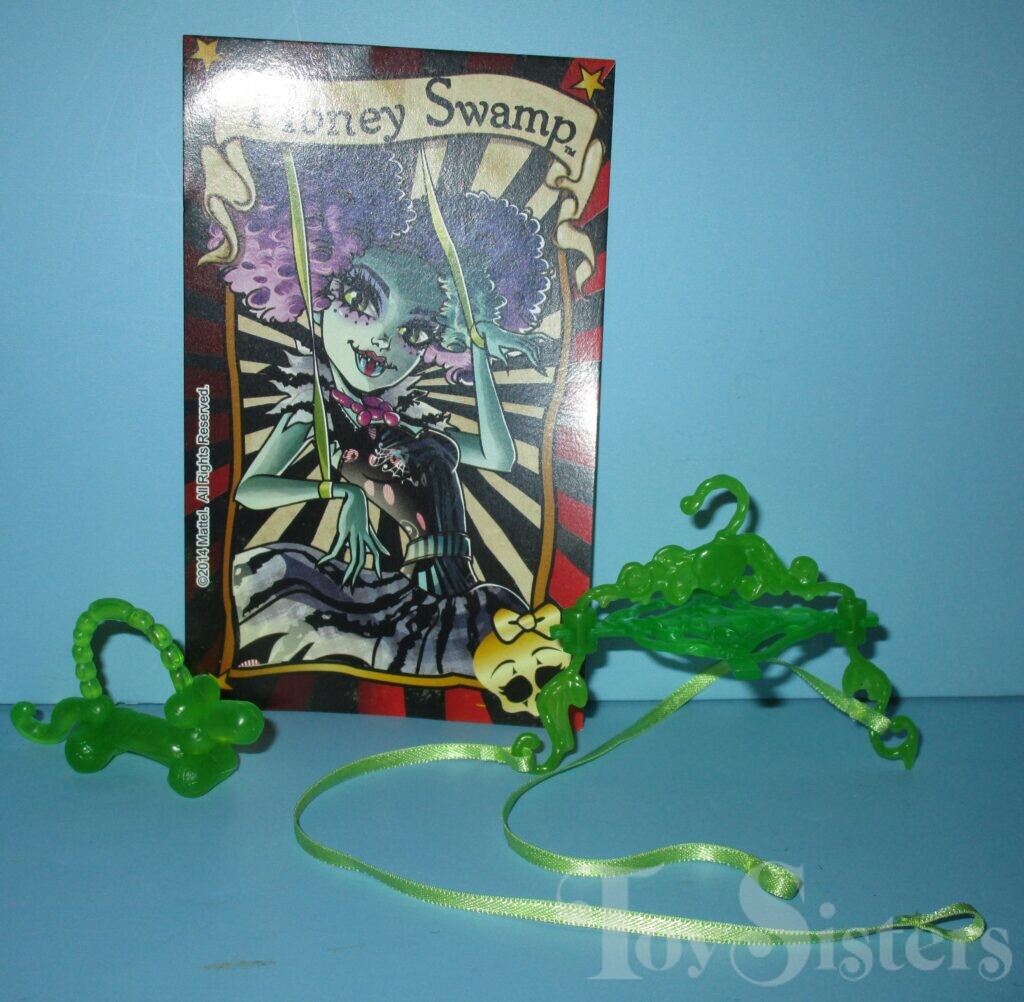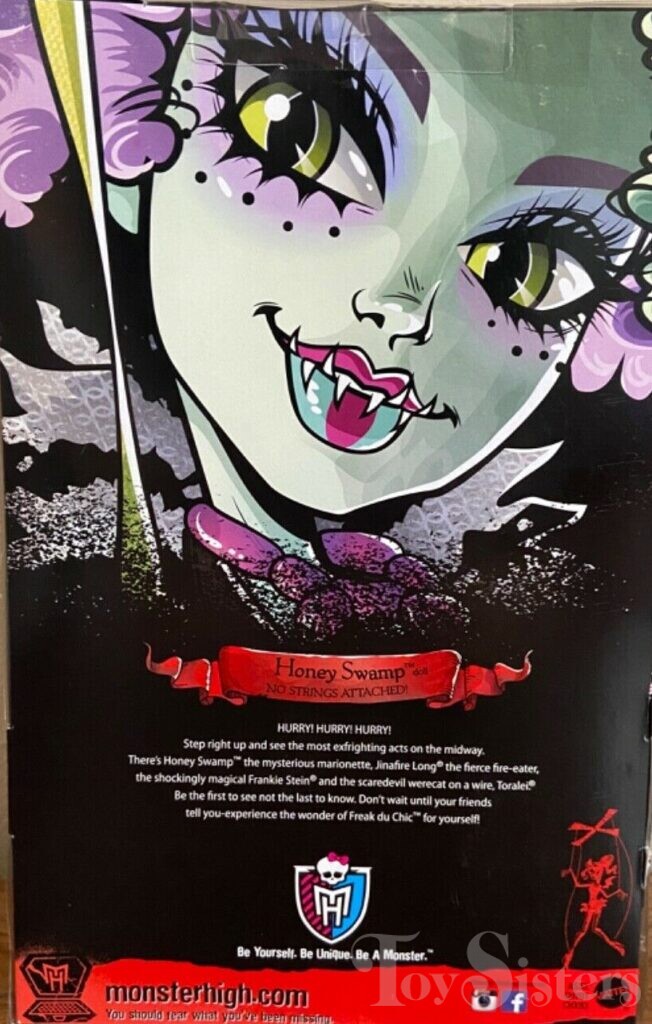 Freak Du Chic Honey Swamp was released in 2015. She came with a purse, green puppet yoke with ribbons, a poster, and a stand. She was made in Indonesia. To see other versions of the Monster High character Honey Swamp, click here.