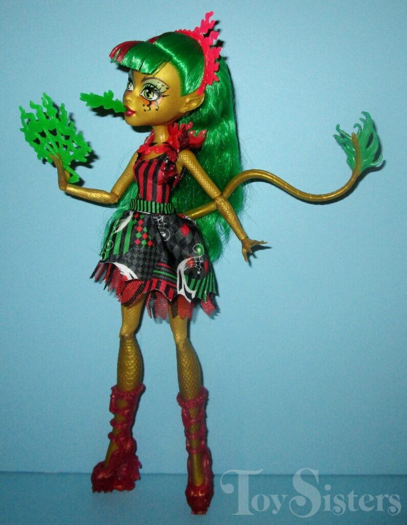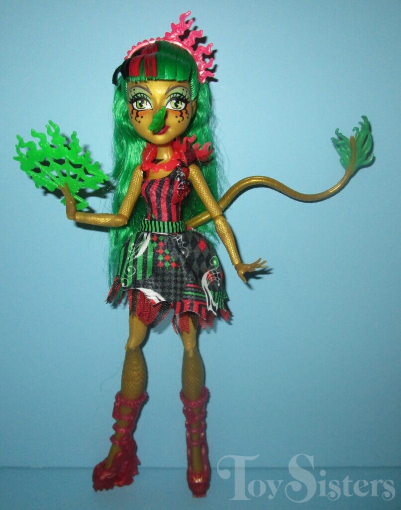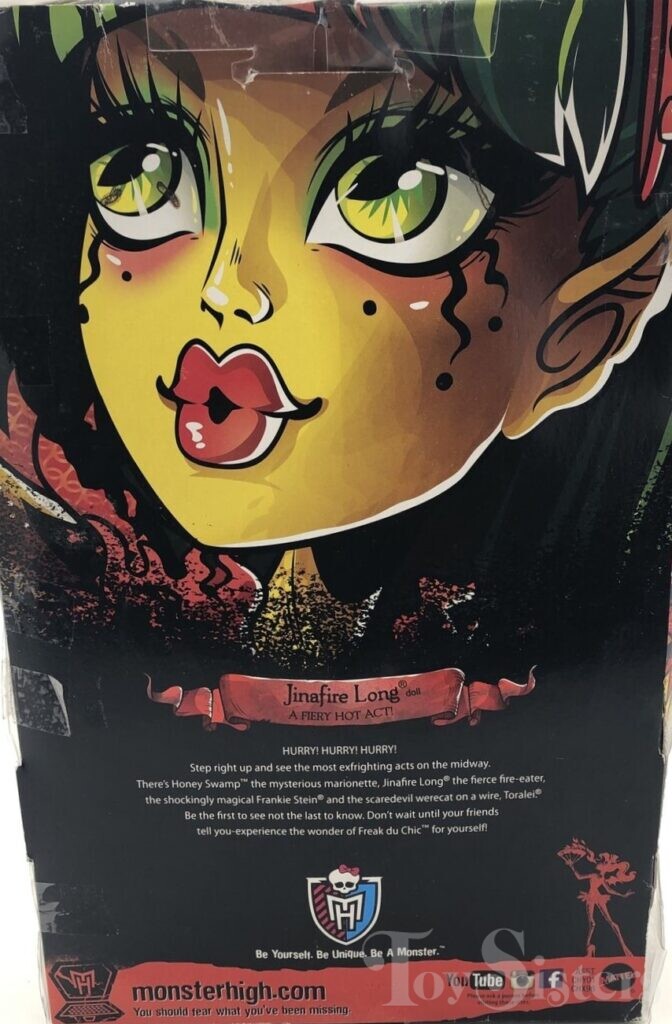Freak Du Chic Jinafire Long was released in 2015. She came with green fire, a green fire fan, a poster, and a stand. She was made in Indonesia. To see other versions of the Monster High character Jinafire Long, click here.