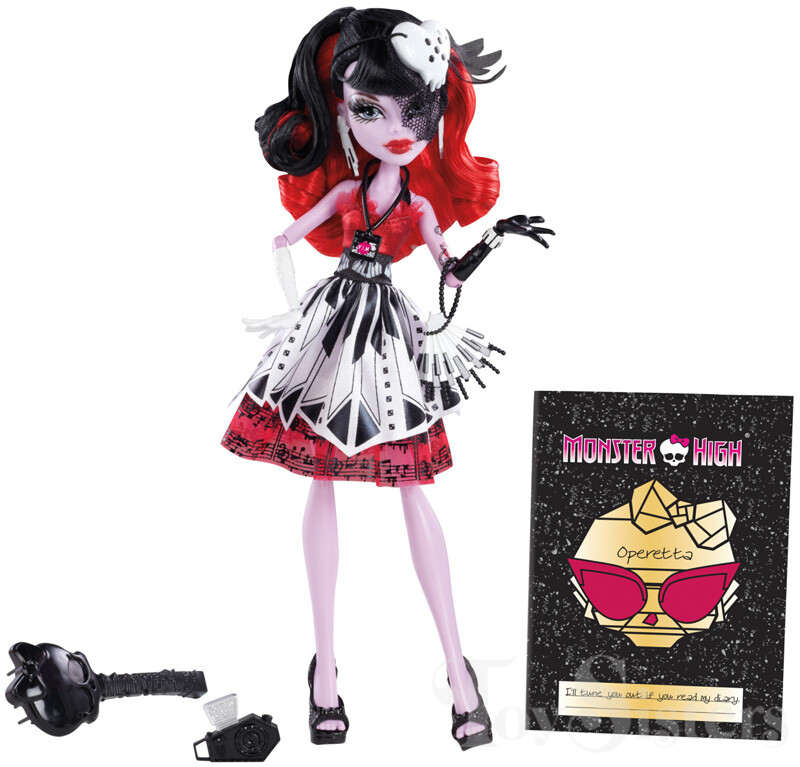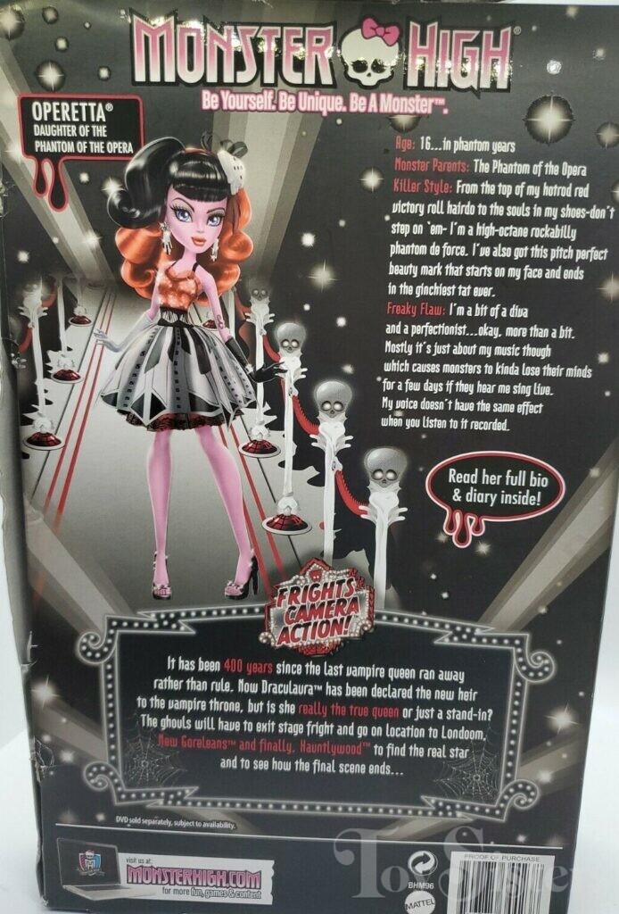 Frights, Camera, Action! Operetta was released in 2014 at Walmart Stores. She was made in Indonesia. She came with a camera, purse, VIP badge, brush, stand, and diary. To see the other releases of the Monster High character Operetta, click here.