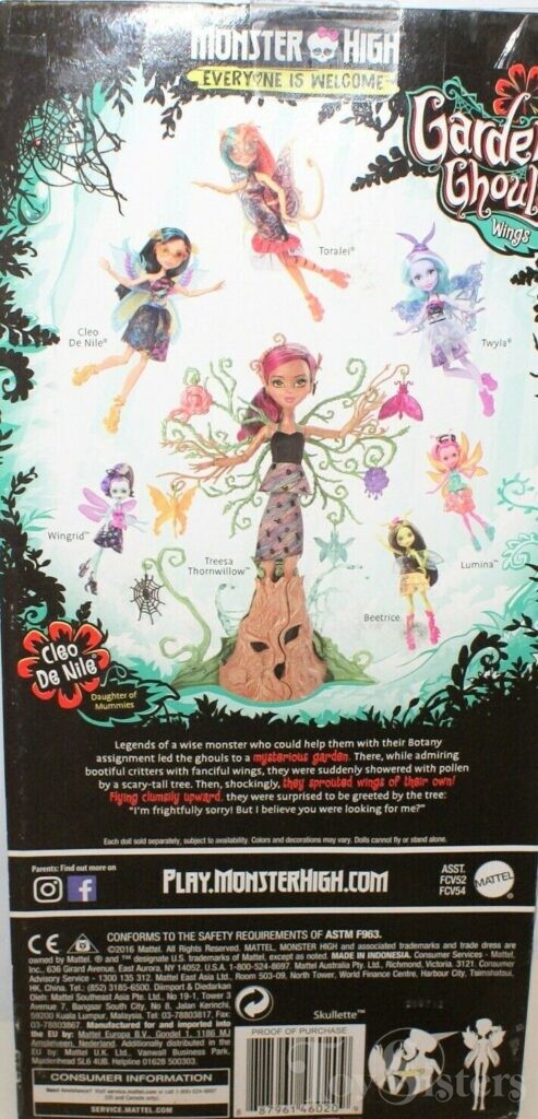 Garden Ghouls Cleo de Nile was released in 2017. She came with glasses. To see the other releases of the Monster High character Cleo de Nile, click here. To see other G2 Monster High dolls, click here.