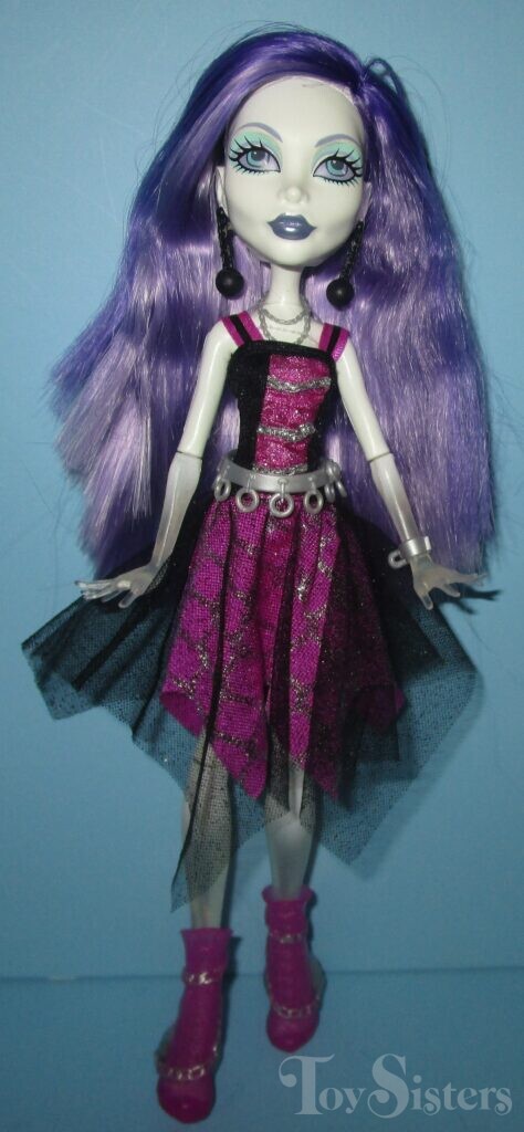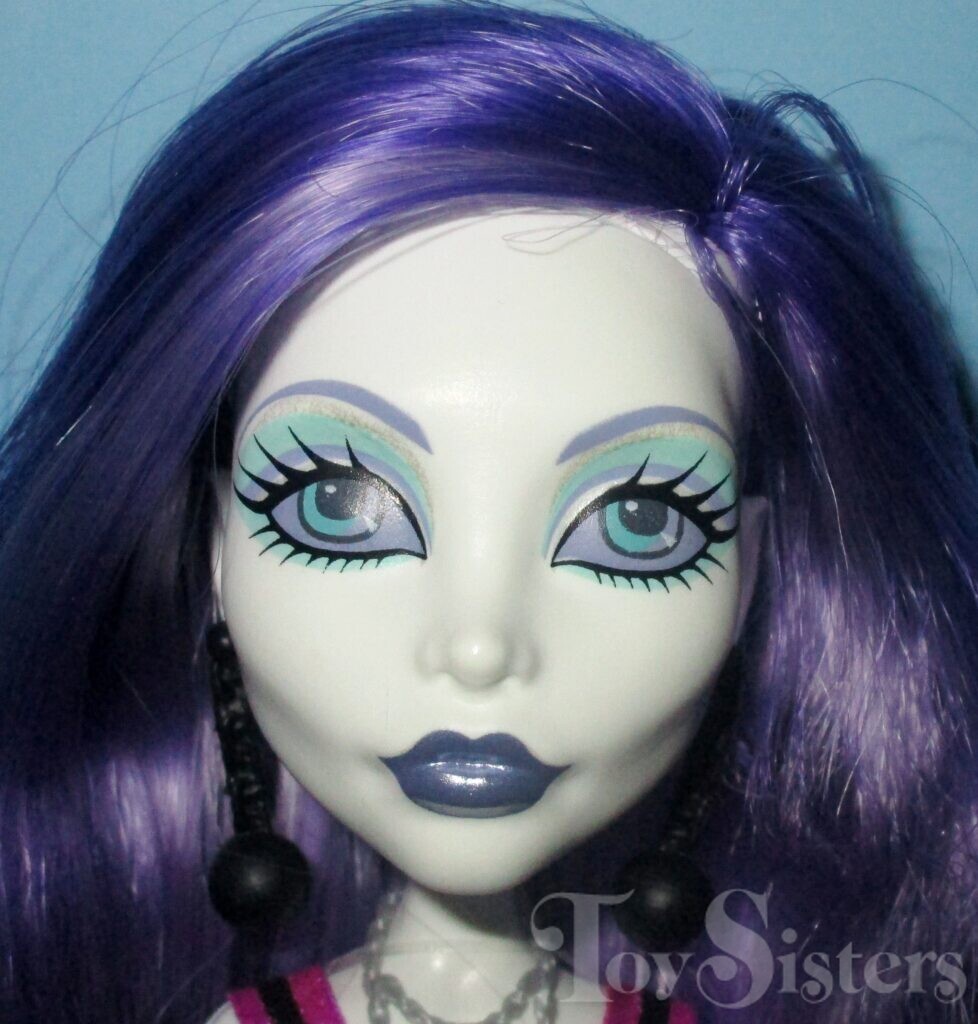 Ghoul’s Alive! Spectra Vondergeist was released in 2012. She was made in China. She came with a stand. When you press a button on her stomach she makes ghostly noises and her arms glow blue. To see the other releases of the Monster High character Spectra Vondergeist, click here.