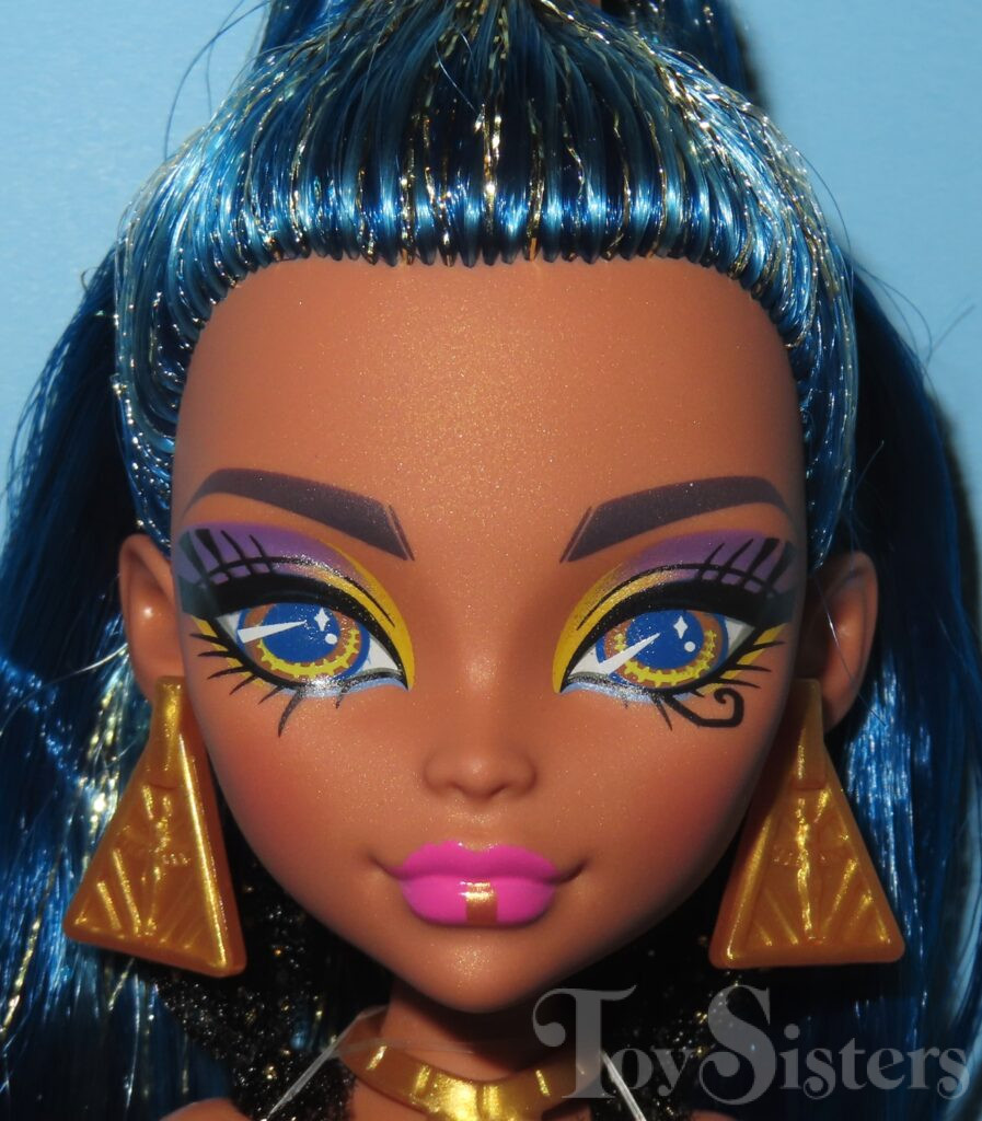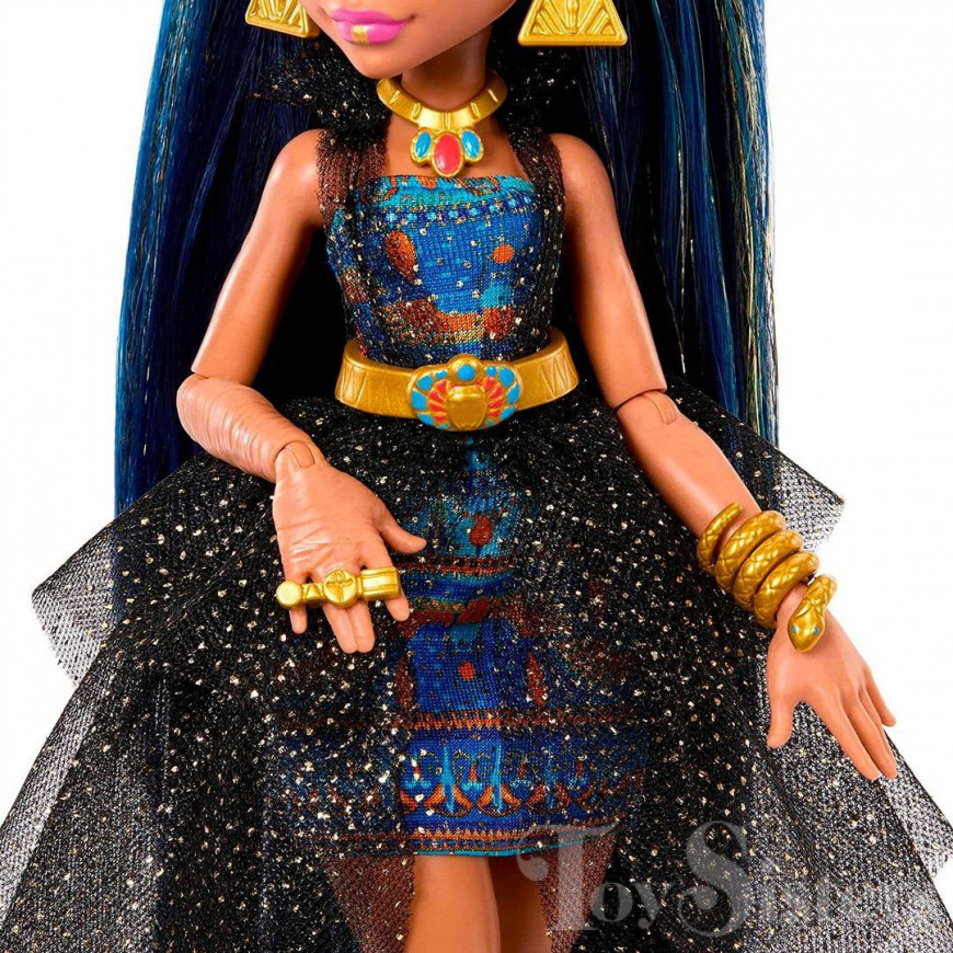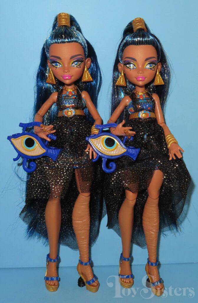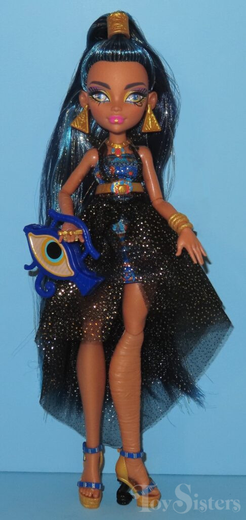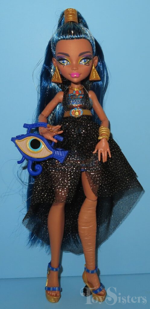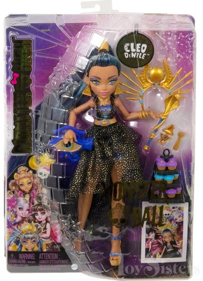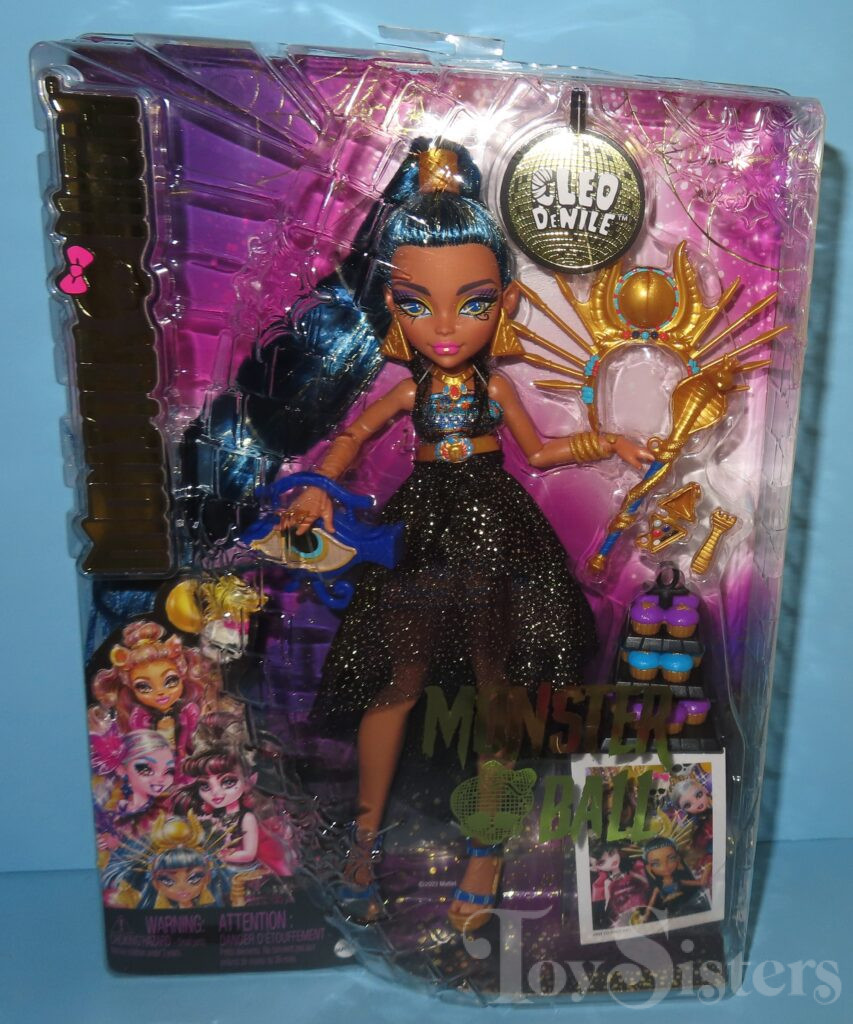 Monster Ball Cleo De Nile was released in 2023. She came with a tray of cupcakes, tongs, scepter, compact, and a purse. She has been found with two different hair shades. To see the other releases of the Monster High character Cleo de Nile, click here.