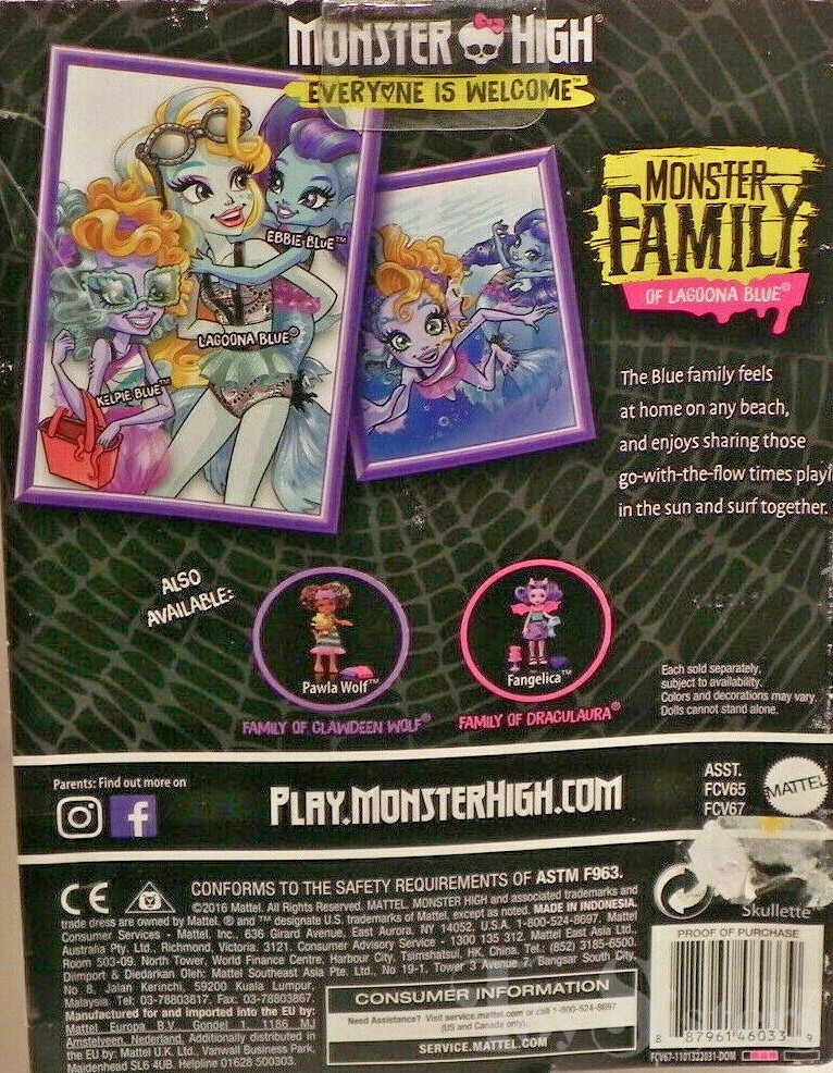Monster Family Ebbie Blue was released in 2017. She came with a ball and pool. This is the only release of Ebbie Blue. To see other G2 Monster High dolls, click here.