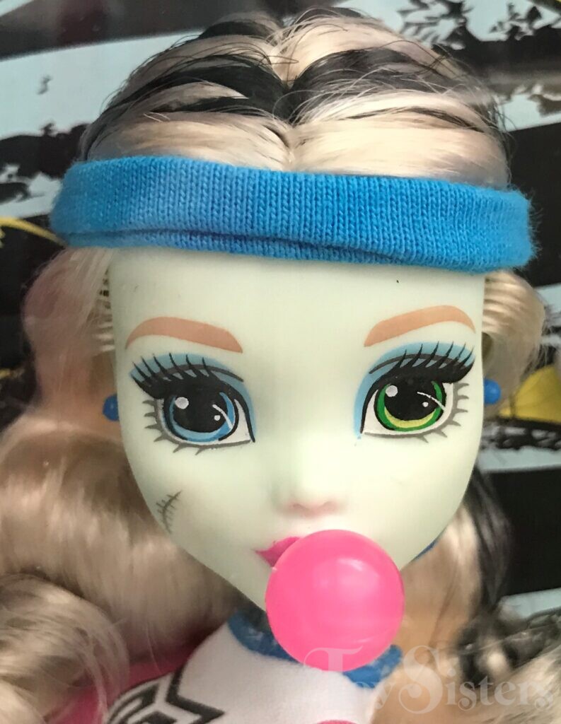 One Team, One Scream Skulltimate Locker Room Frankie Stein was released in 2017. She came with two pink lockers with locks, a bench, a whiteboard, a racket, a tennis ball, a soccer ball, a bone bat, an eye-ball, a mitt, a green bag, a cup, and a ball cap. To see the other releases of the Monster High character Frankie Stein, click here. To see other G2 Monster High dolls, click here.