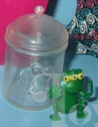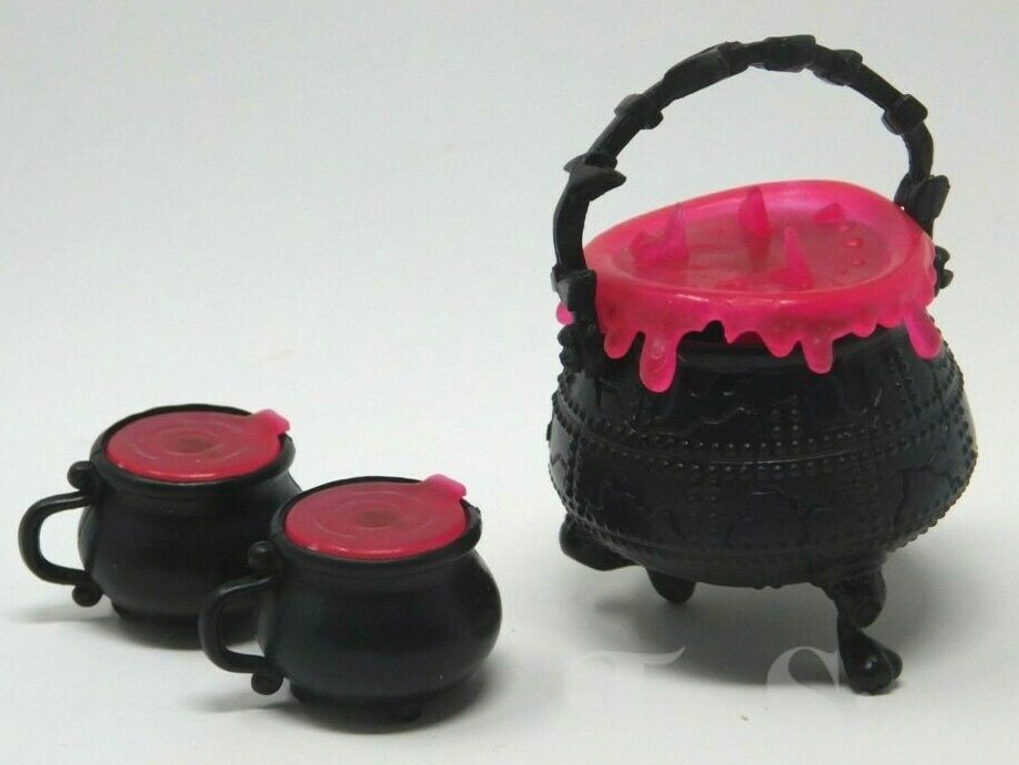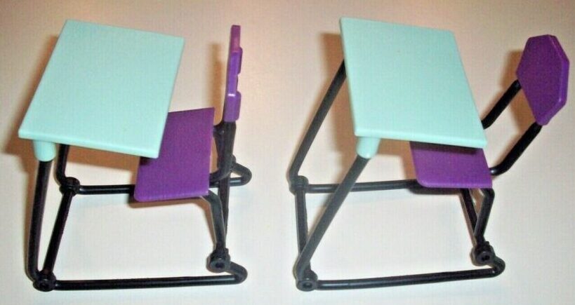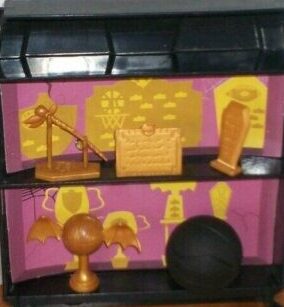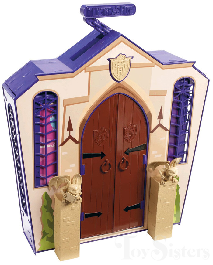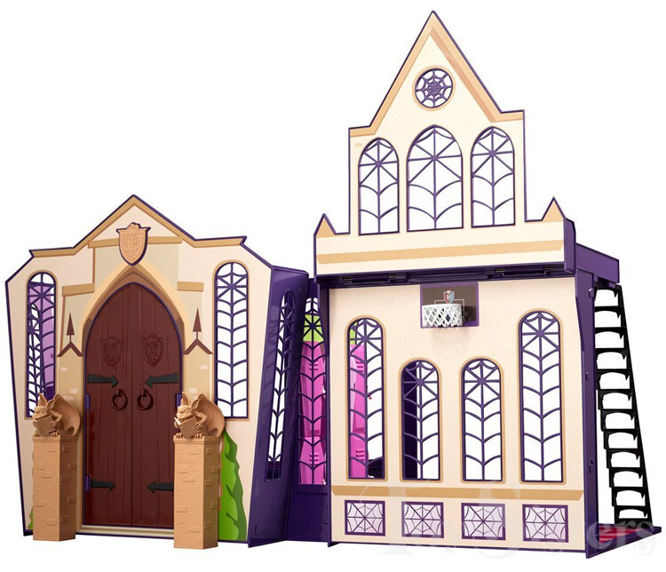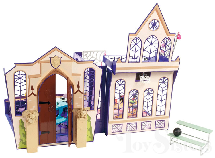 The High School playset was released in 2012. The High School included two desks, a blue cart, a three-eyed frog in a jar, a lunch table, two drinks, a cauldron, two bowls with green food, a skull disco ball, two pencils, two notebooks, a black binder, six white skull locker locks, two gargoyles with books, a stereo/trophy case, four different trophies, a black casket ball, and two spiderwebs with pink skull decorations.
