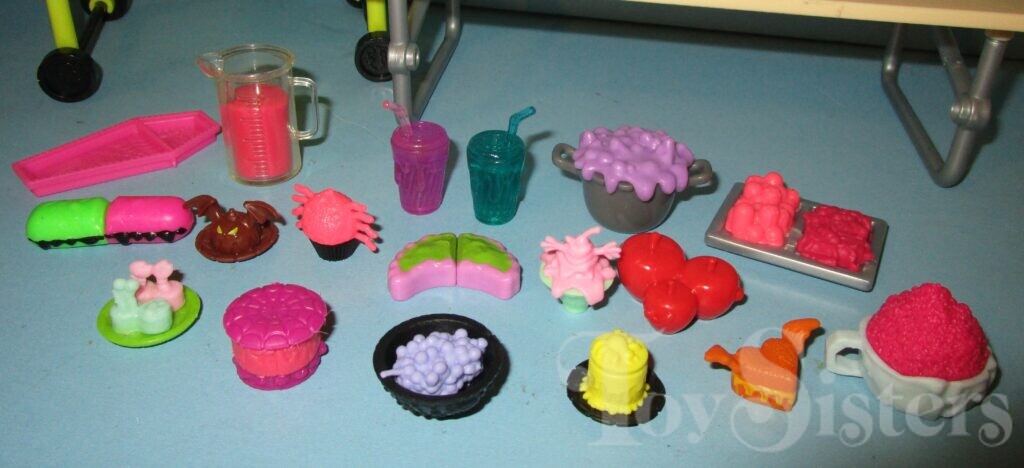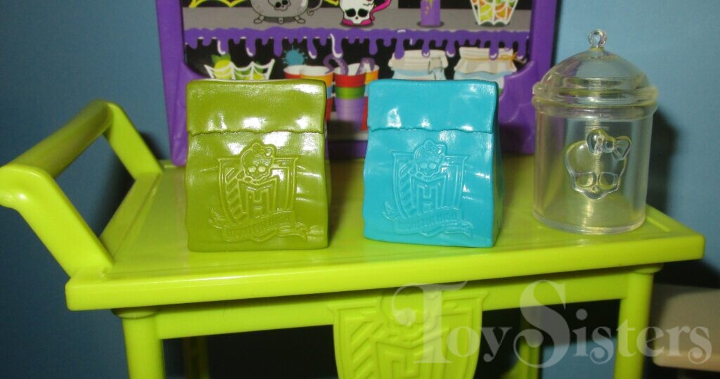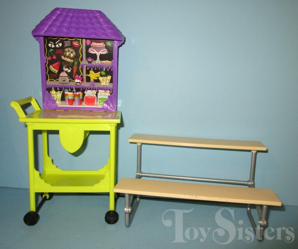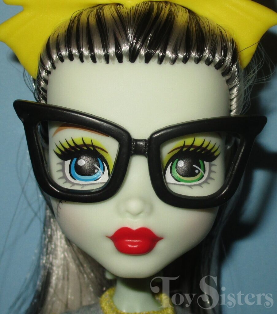 School Spirit Frankie Stein was released in 2017. She came with a bag, glasses, cafeteria table, cart, and lots of food. She is not articulated at her elbows or wrists. To see the other releases of the Monster High character Frankie Stein, click here. To see other G2 Monster High dolls, click here.