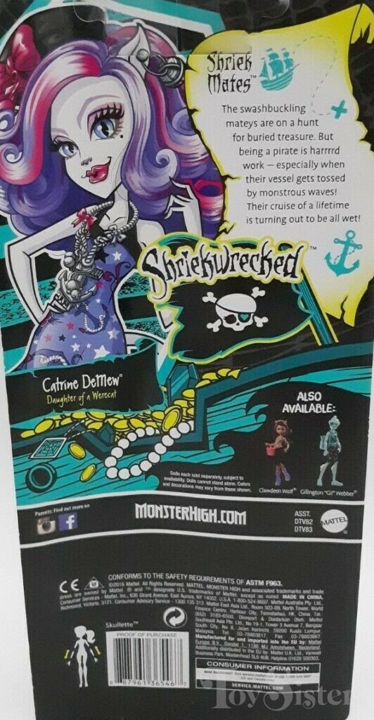 Shriekwrecked Catrine DeMew was released in 2016. She came with a purse. To see the other versions of the Monster High character Catrine DeMew, click here. To see other G2 Monster High dolls, click here.