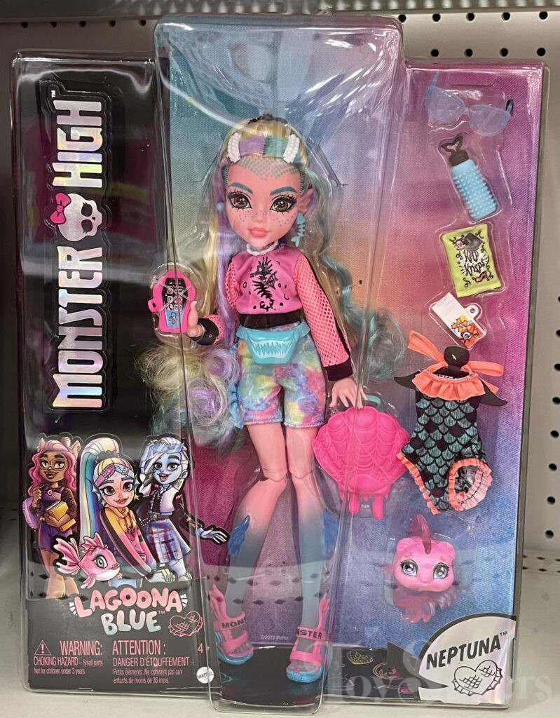 Signature Lagoona Blue was released in 2022. She came with a bottle, snacks, bag, glasses, swimsuit, phone, and pet (Neptuna). To see the other releases of the Monster High character Lagoona Blue, click here.