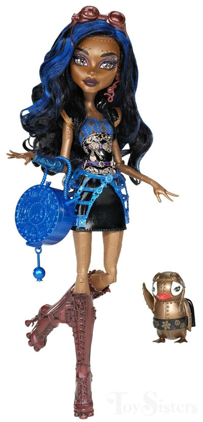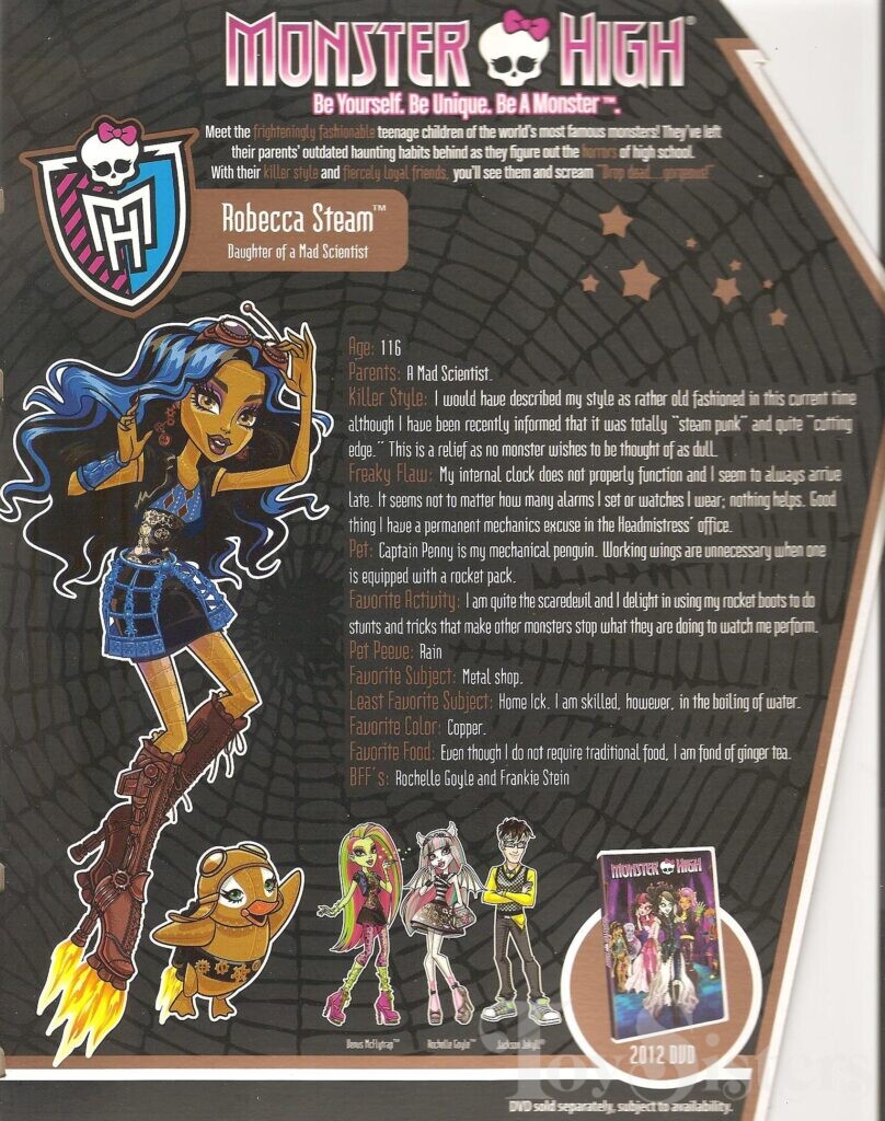 Signature Robecca Steam was released in 2012. She came with a purse, diary, stand, brush, and pet penguin (Penny). She was made in Indonesia. To see other versions of the Monster High character Robecca Steam, click here.