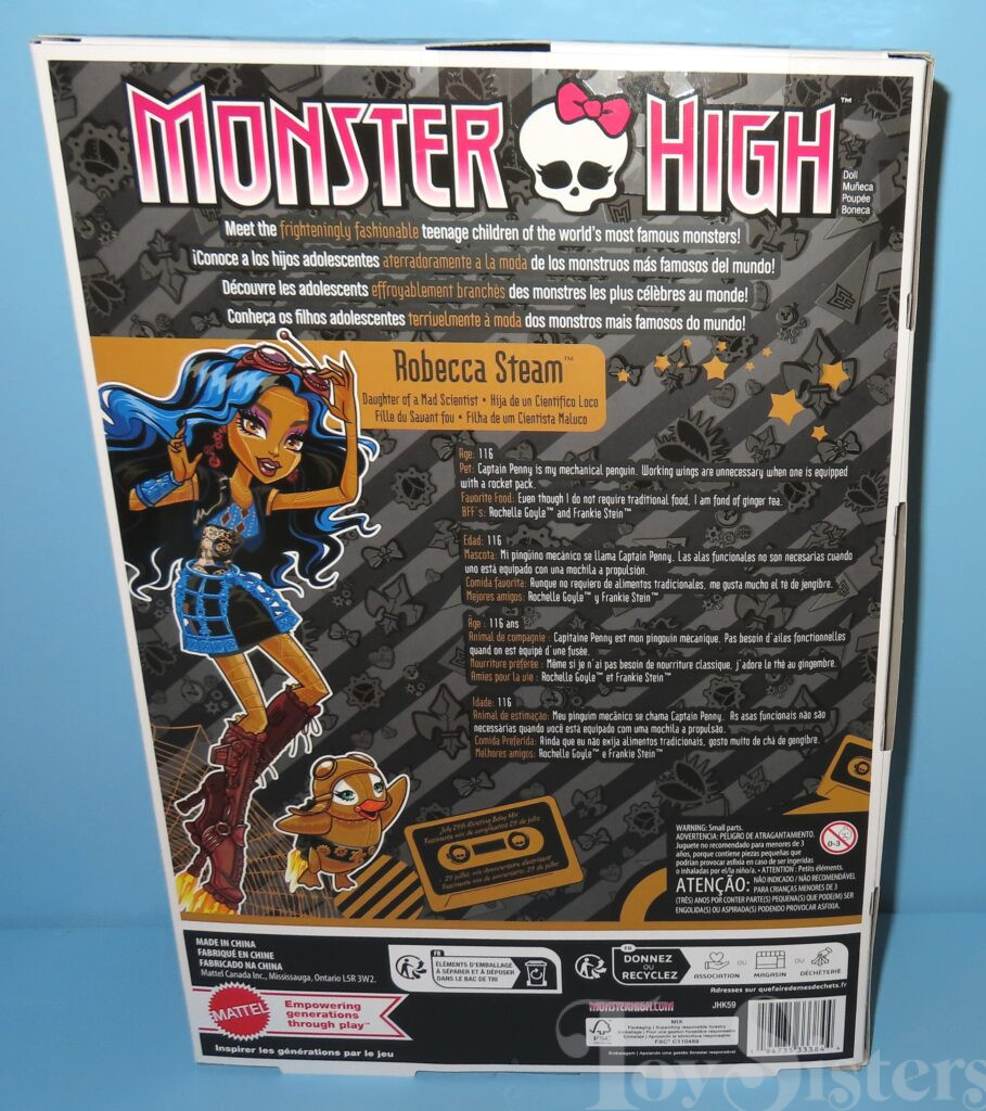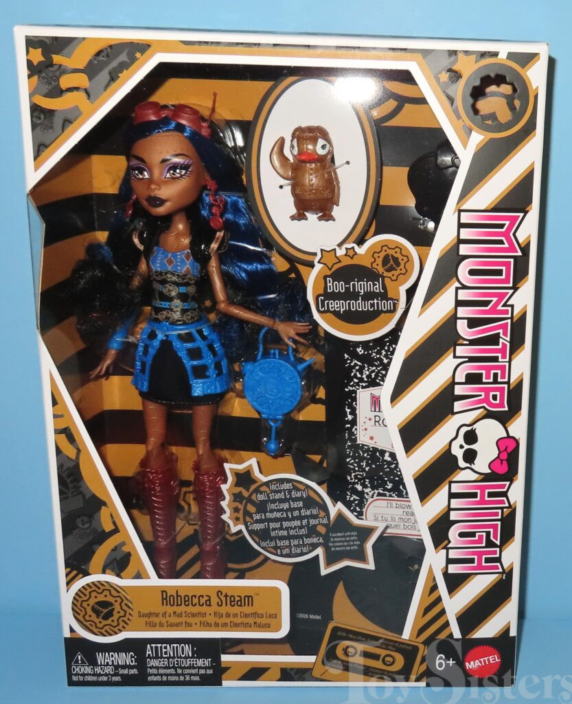 Signature Robecca Steam was released in 2012. She came with a purse, diary, stand, brush, and pet penguin (Penny). She was made in Indonesia. In 2026, a Boo-Original Creeproduction was released. To see other versions of the Monster High character Robecca Steam, click here.