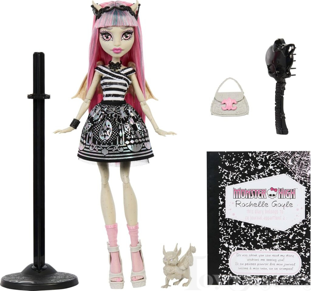 Signature Rochelle Goyle was released in 2012. She came with a purse, diary, stand, brush, and pet gargoyle griffin (Roux). She was made in Indonesia. In 2026 a Boo-Original Creeproduction was released. To see other versions of the Monster High character Rochelle Goyle, click here.
