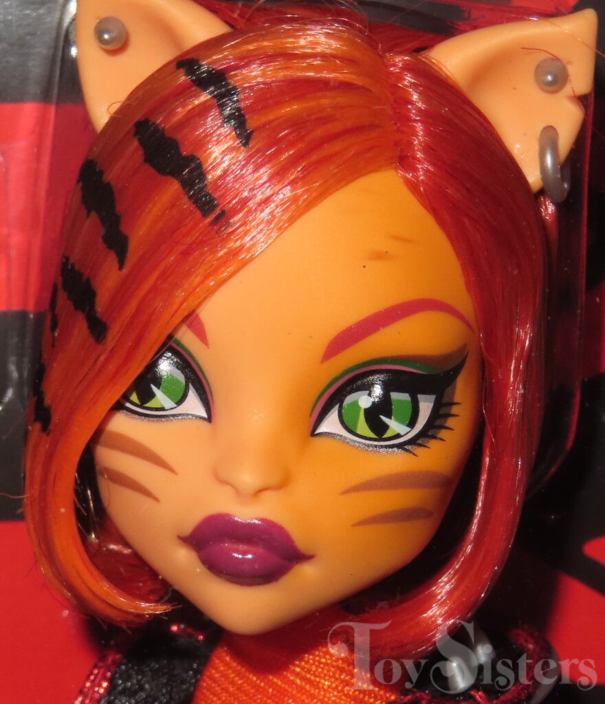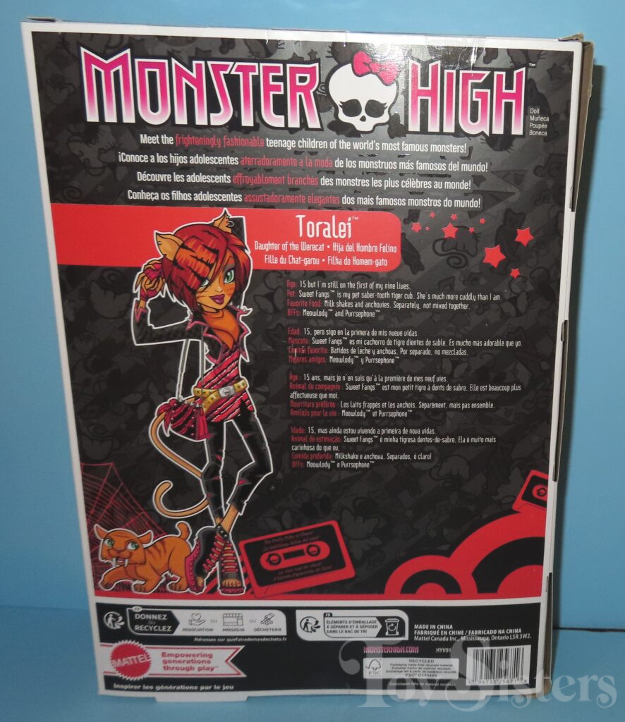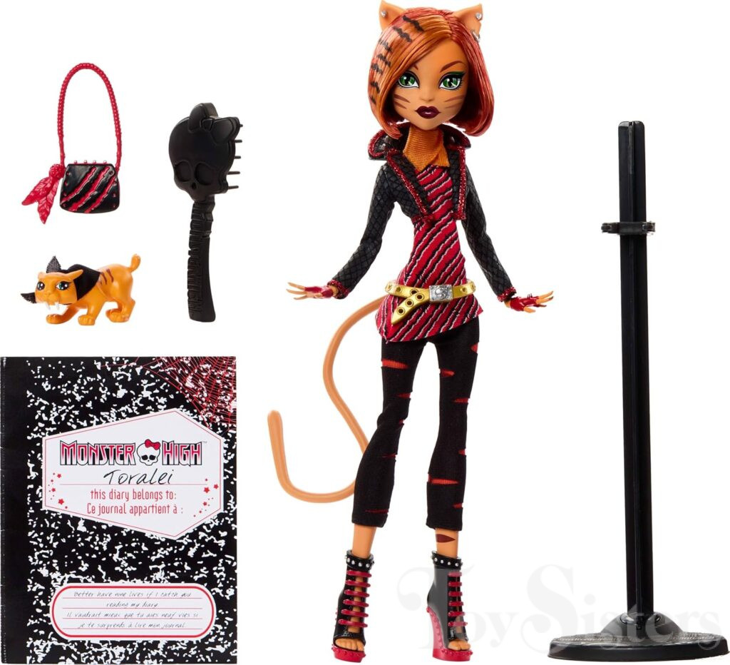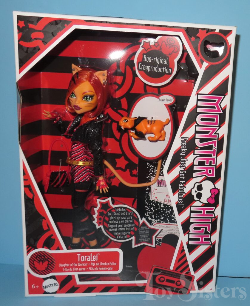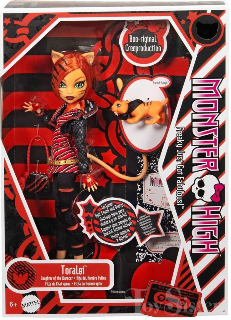 Signature Toralei Stripe was released in 2011/2012. She came with a purse, diary, stand, brush, and pet saber-toothed tiger (Sweet Fang). She was made in Indonesia. In 2025 a Boo-Original Creeproduction was released. This version was made in China. To see other versions of the Monster High character Toralei Stripe, click here.