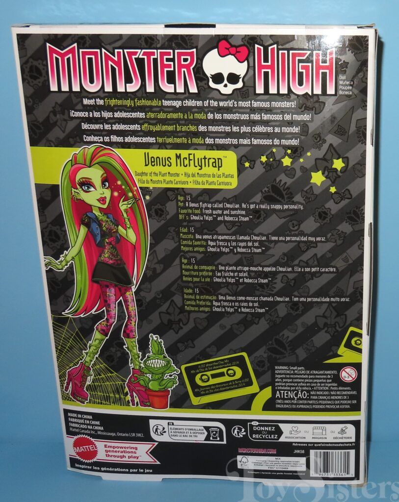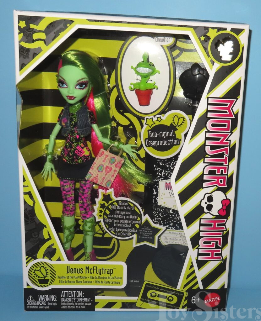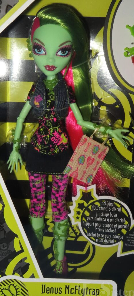 Signature Venus McFlytrap was released in 2012. She came with a bag, diary, stand, brush, and pet venus flytrap (Chewlian). She was made in Indonesia. In 2026 a Boo-Original Creeproduction was released. To see other versions of the Monster High character Venus McFlytrap, click here.
