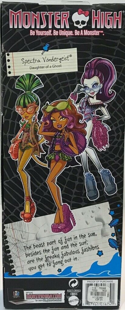 Swim Class Spectra Vondergeist was released in 2014 at Justice stores. She was made in Indonesia. She came with sunglasses, a towel, and bag. To see the other versions of the Monster High character Spectra Vondergeist, click here.