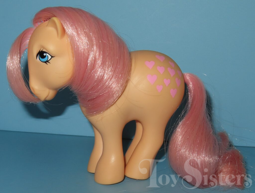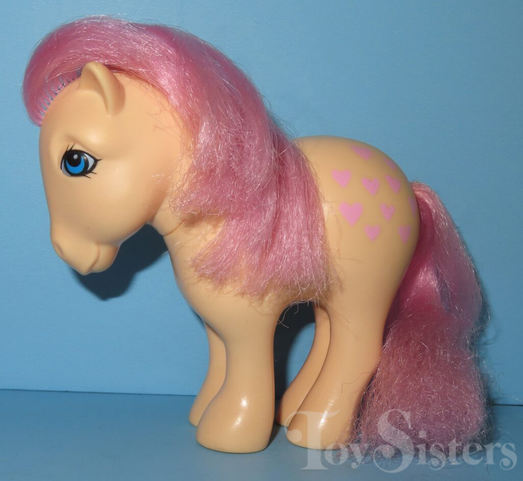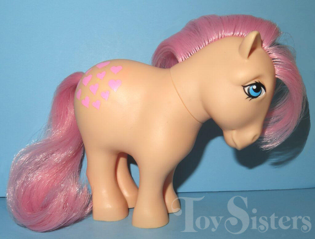 Peachy was first released in 1983 with Flat Feet (FF). She was released again with Concave Feet (CF). CF Peachy’s heart symbol color and hoof stamp can vary. She came with the Pretty Parlor Playset. She is in the Minty Pose. To view other ponies by year/series, click here.