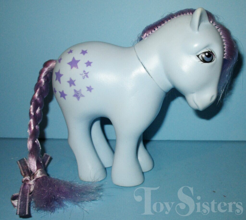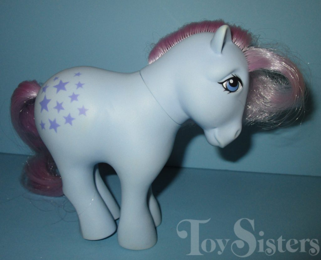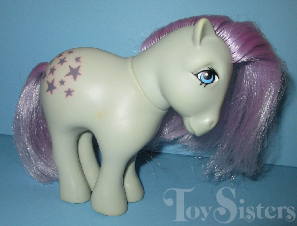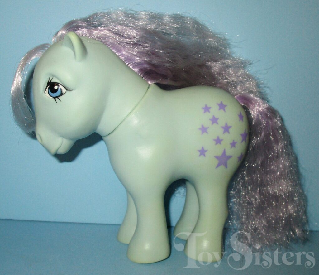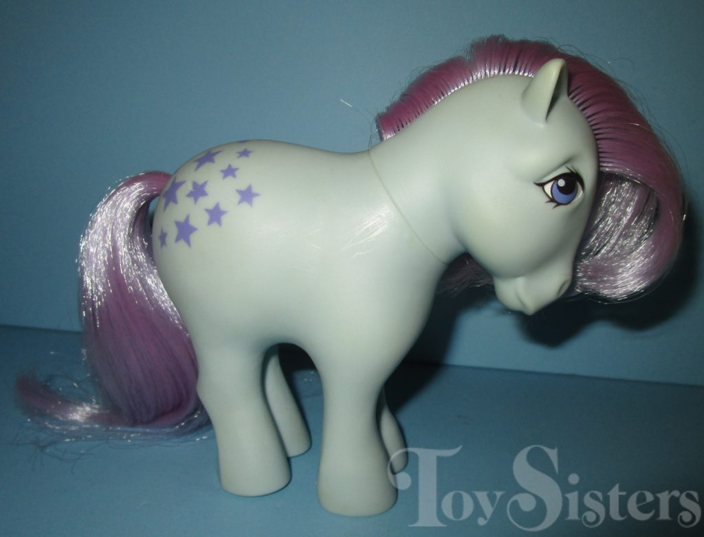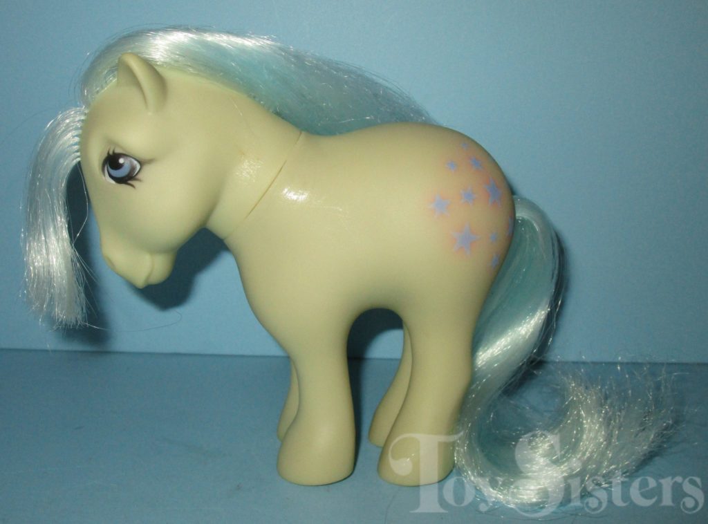 Blue Belle was first released in 1982 with Flat Feet (FF). She was released again the next year with Concave Feet (CF). The CF version was also released as a mail order. She has lots of color variations (which may relate to the factory run of the particular pony, the release style of the particular pony, or how the particular pony has aged). She came with a white comb and ribbon. She is in the Minty Pose. To view other ponies by year/series, click here.