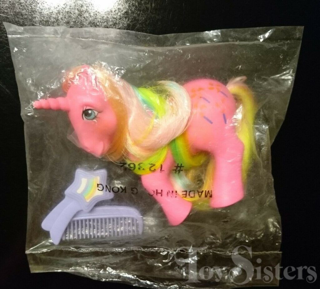 Pinwheel was first released in 1984 and is a Rainbow Pony. She came with a purple shooting star brush, purple comb and white ribbon. Pinwheel can change color over time to a hot pink body color. This is called regrind. She was also released as a mail order- this version is a hotter pink. She is in the Gusty Pose. To view other ponies by year/series, click here.