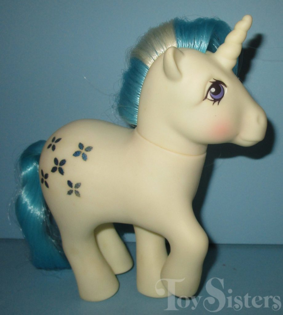 Majesty was first released in 1983 and is a Playset Pony. This version was made in Hong Kong. She came with the Dream Castle Playset and Spike the Dragon. She was then released several more times. The color of Majesty’s eyes vary (from blue to purple) and she has a harder-to-find “Made in China” version. She is in the Glory Pose. To view other ponies by year/series, click here.