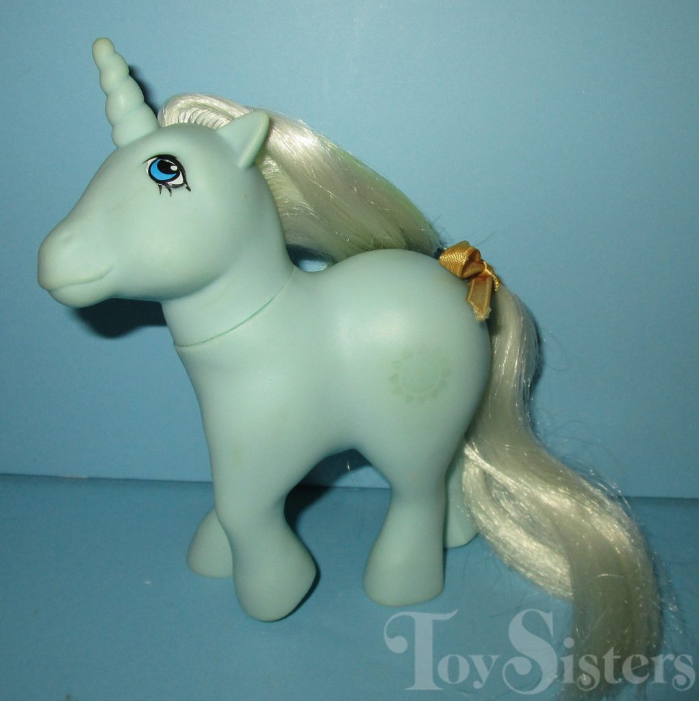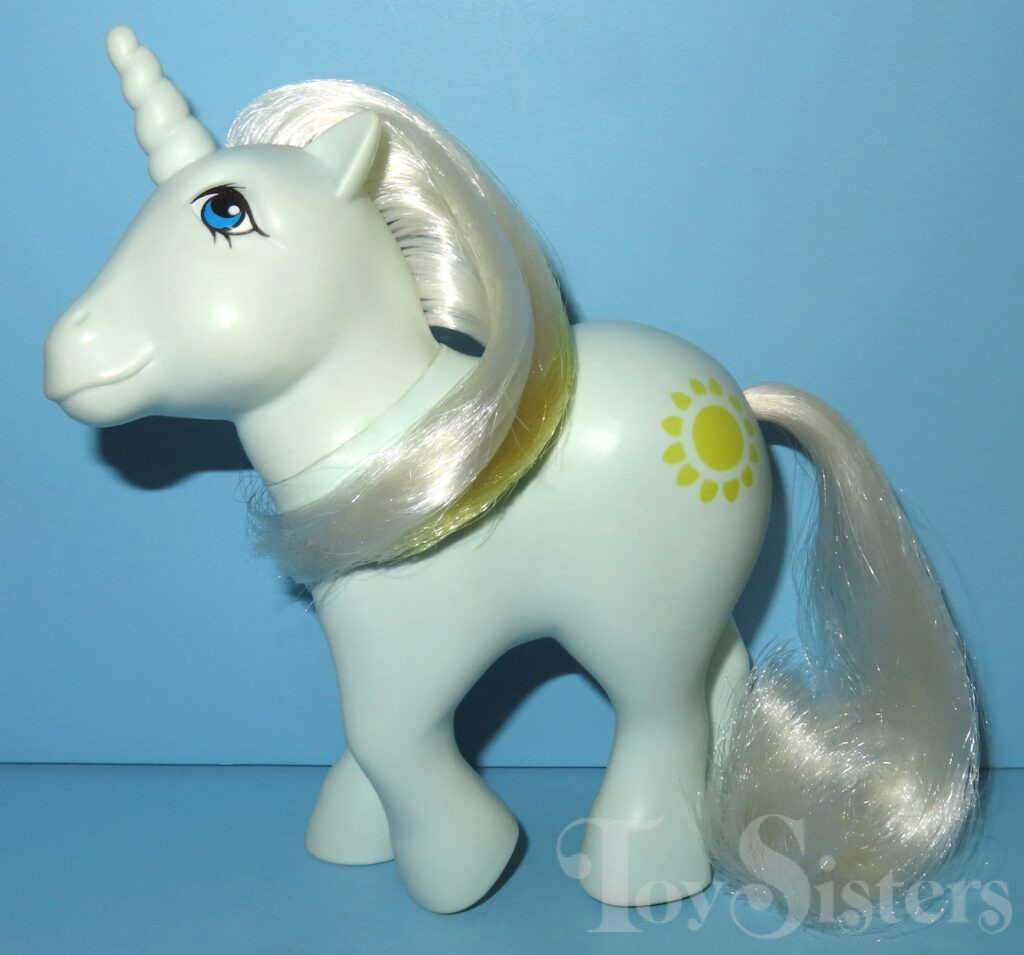 Sunbeam was first released in 1983 and is a Unicorn Pony. She came with a yellow star comb and ribbon. Her body color has a light and dark variation. In my experience, the lighter version is more common. She is in the Moondancer Pose. To view other ponies by year/series, click here.