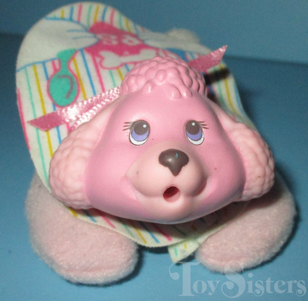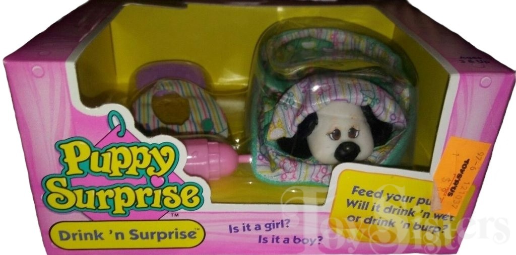 The Drink ‘N Surprise Puppies were released in single packs. They have the head molds of other puppies, except they have holes in their mouths for a bottle to fit into. They also have slick plastic-lined undersides with a tube that releases the water you give them in classic drink and wet style. To view other types of Hasbro Puppy Surprise puppies, click here.