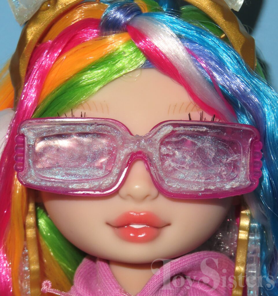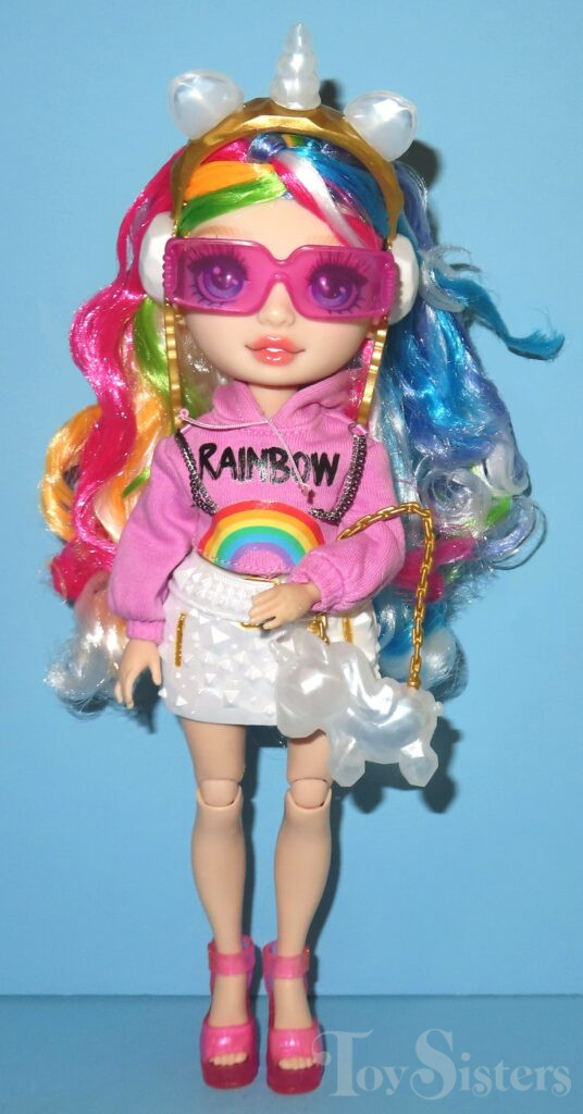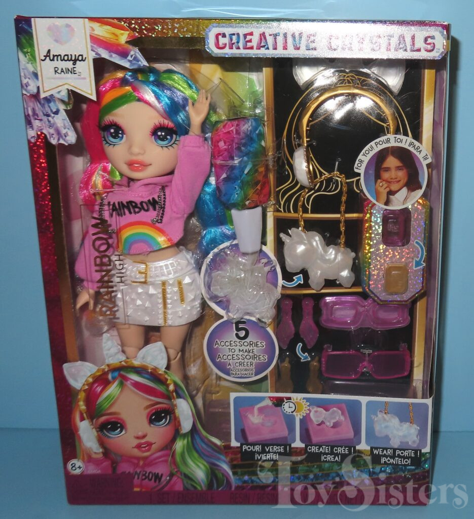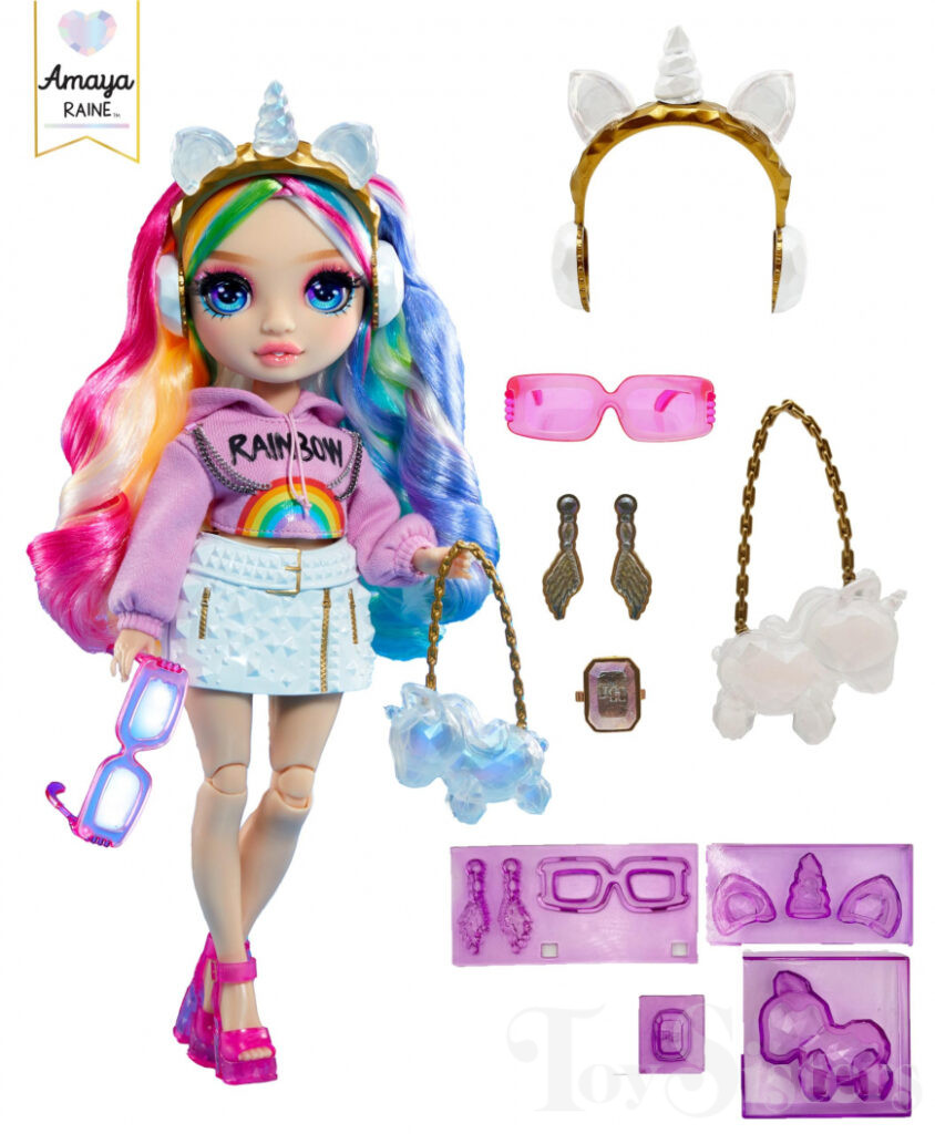 Creative Crystals Amaya Raine was released in 2025 by MGA. Her wrists are not articulated. We found the resin hard to use and don’t recommend these dolls for kids. To return to the Rainbow High menu, click here. To return the the Rainbow High Character menu, click here.