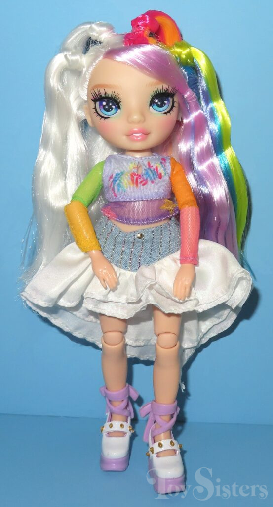 Junior High Amaya Rayne was released in 2025 by MGA. The Junior High dolls are smaller than regular Rainbow High dolls. She comes with a comb and keyboard. To return to the Rainbow High menu, click here. To return the the Rainbow High Character menu, click here.
