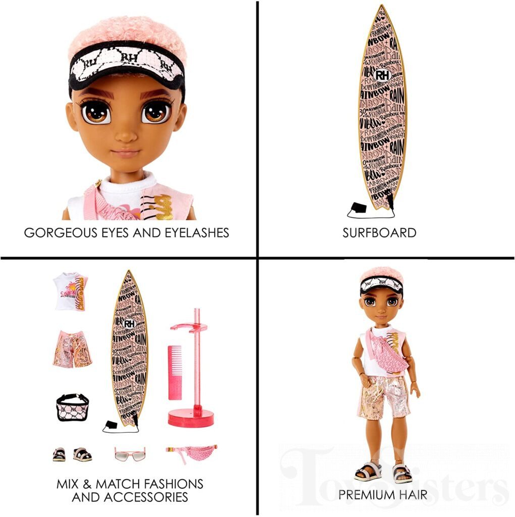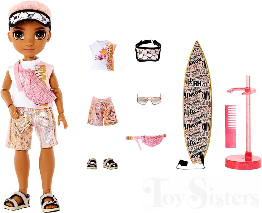 Pacific Coast Finn Rosado was released in 2022 by MGA. He came with a surf board and sunglasses. To return to the Rainbow High Series menu, click here. To return the the Rainbow High Character menu, click here.