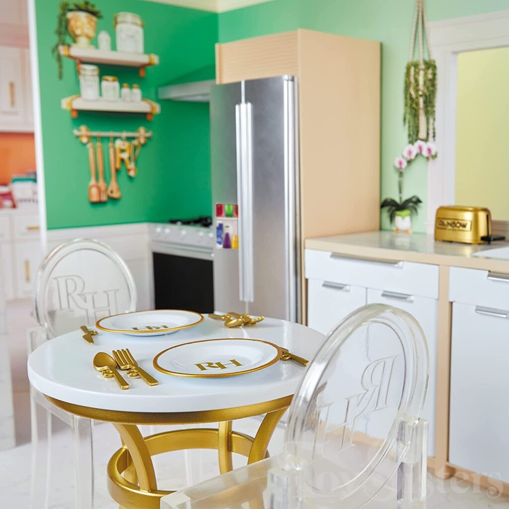 The Rainbow High House was released in 2021 by MGA. The house includes a clothing rack, hangers, cases, 50+ accessories, hot tub, refrigerator, stove, sink, washer, dining table, chairs, stool, counter, bathtub, bath sink, toilette, couch, bed, end tables, and more. To return to the Rainbow High menu, click here.